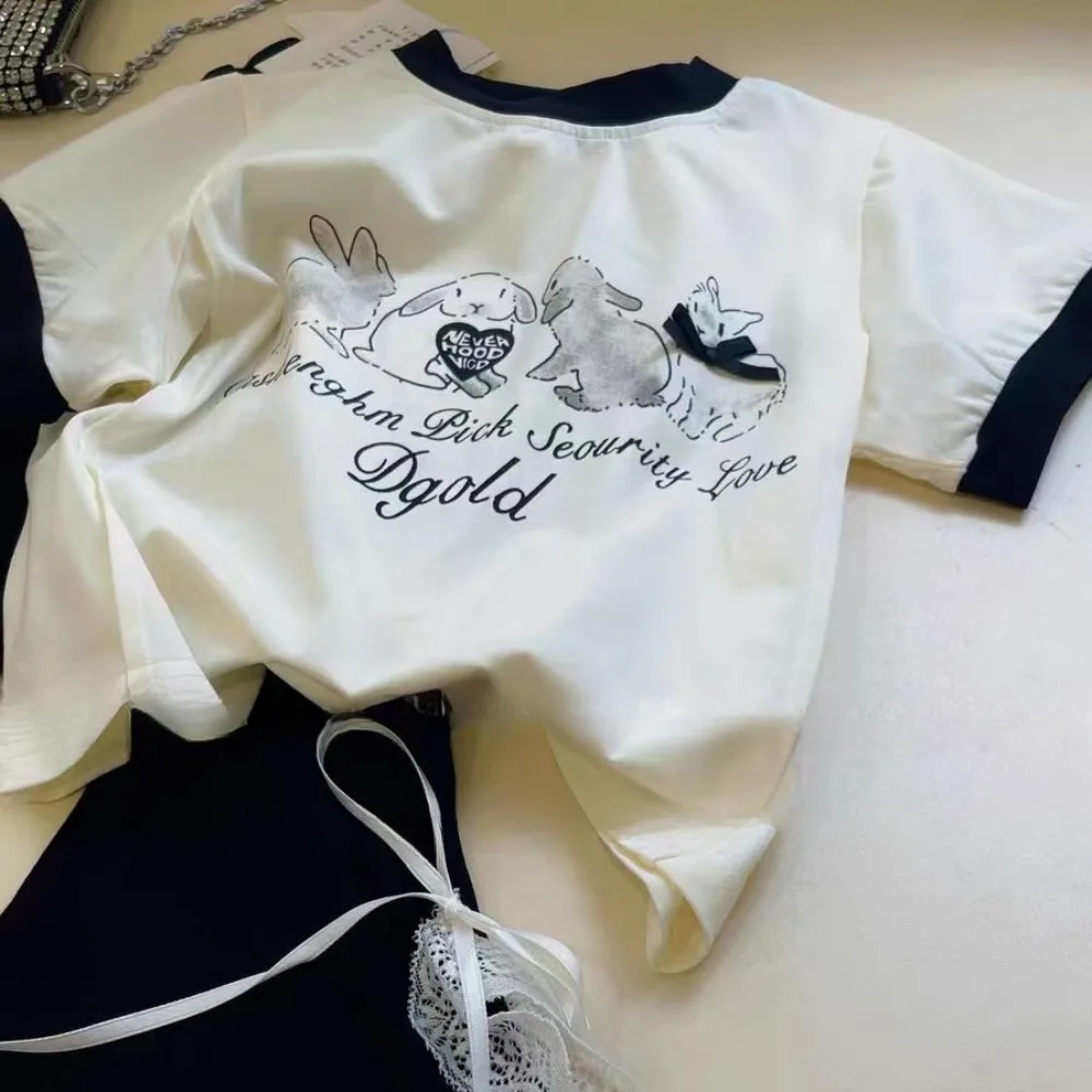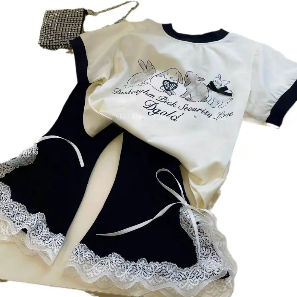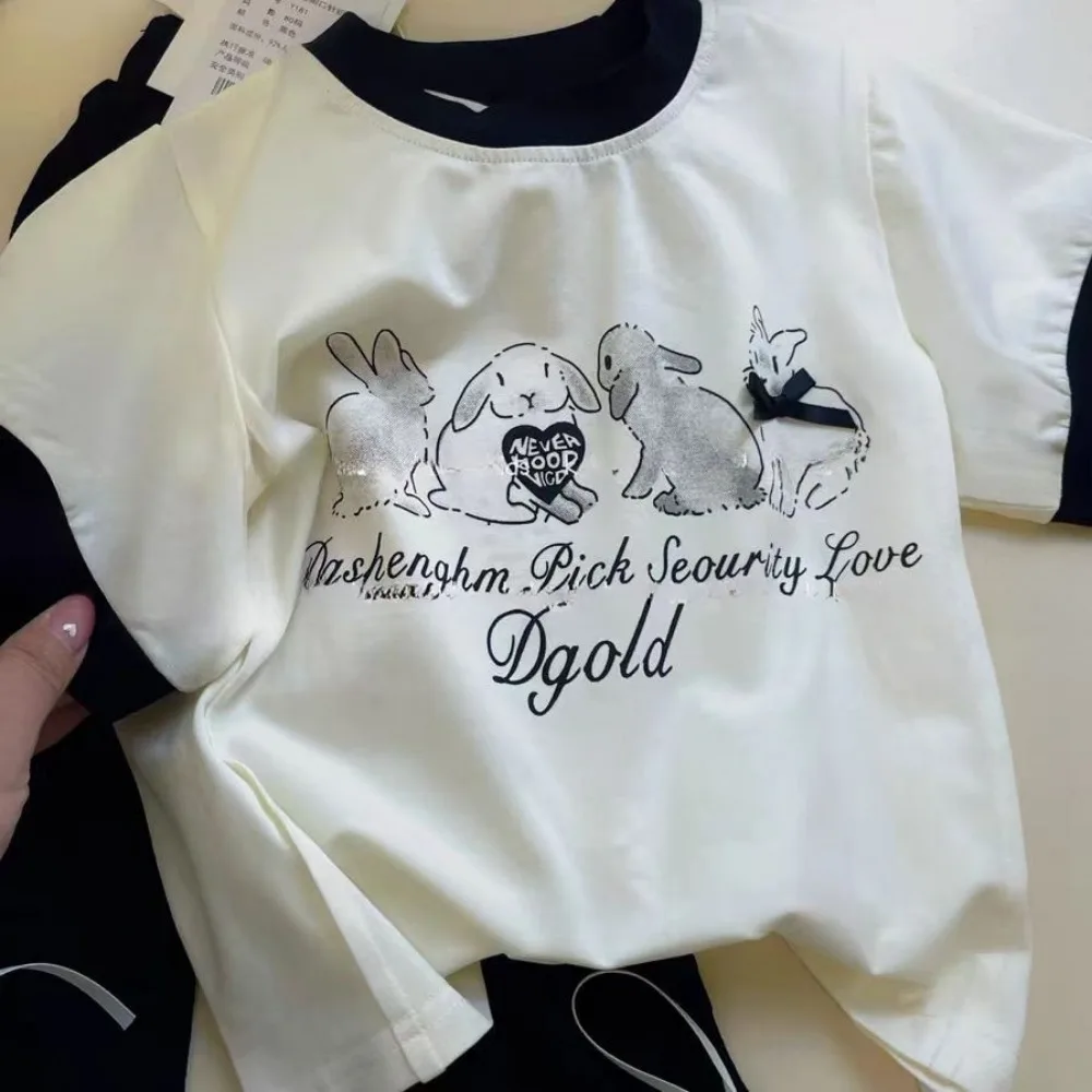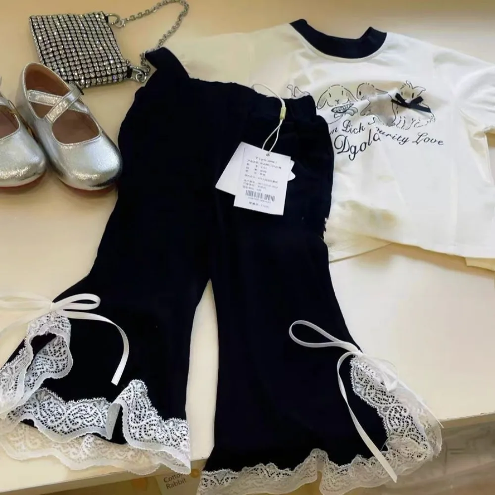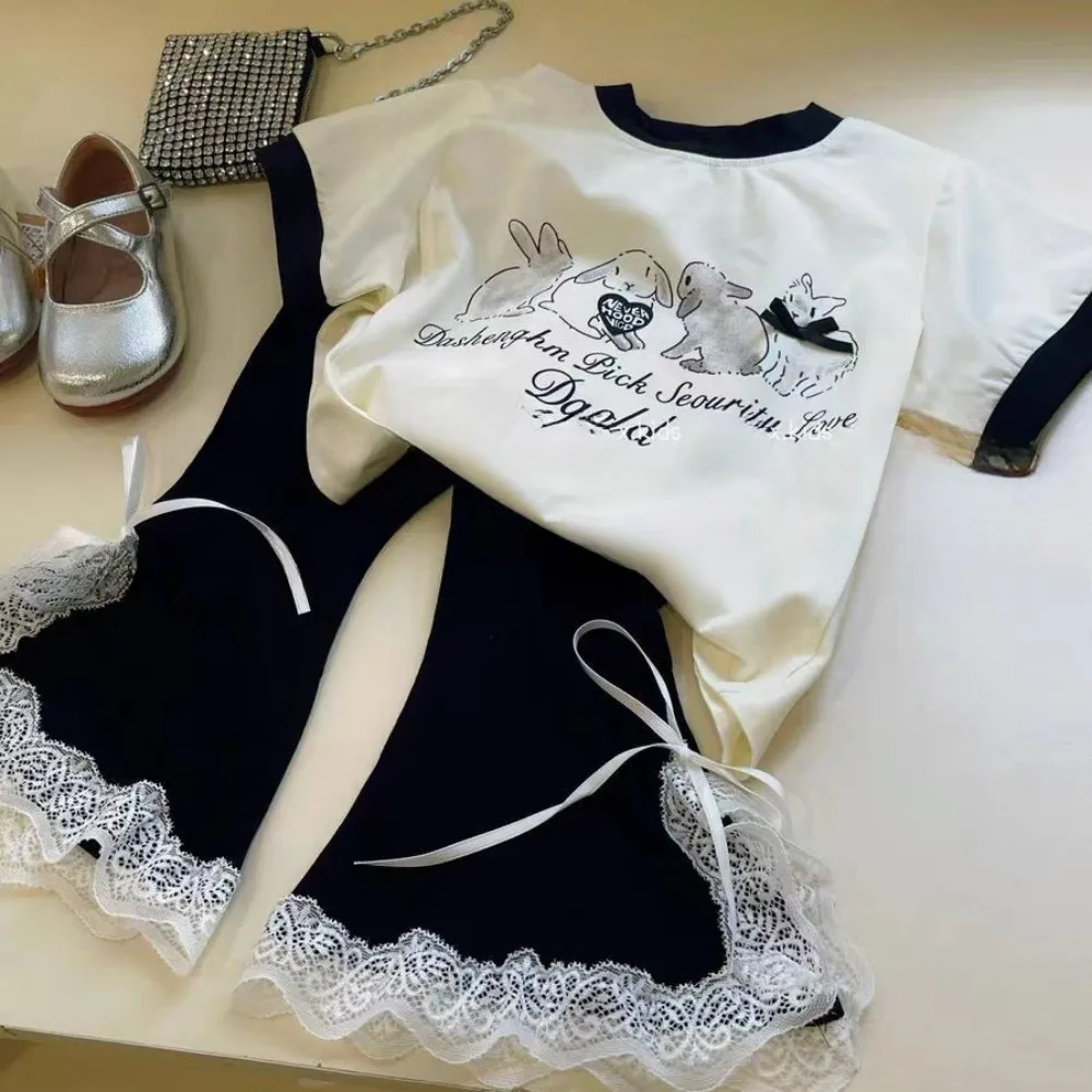 Bear Leader 2025 Fashionable New Casual Easter Girls Clothes Rabbit Print Short Sleeved+lace Bow Bell Bottom Pants Two-piece Set