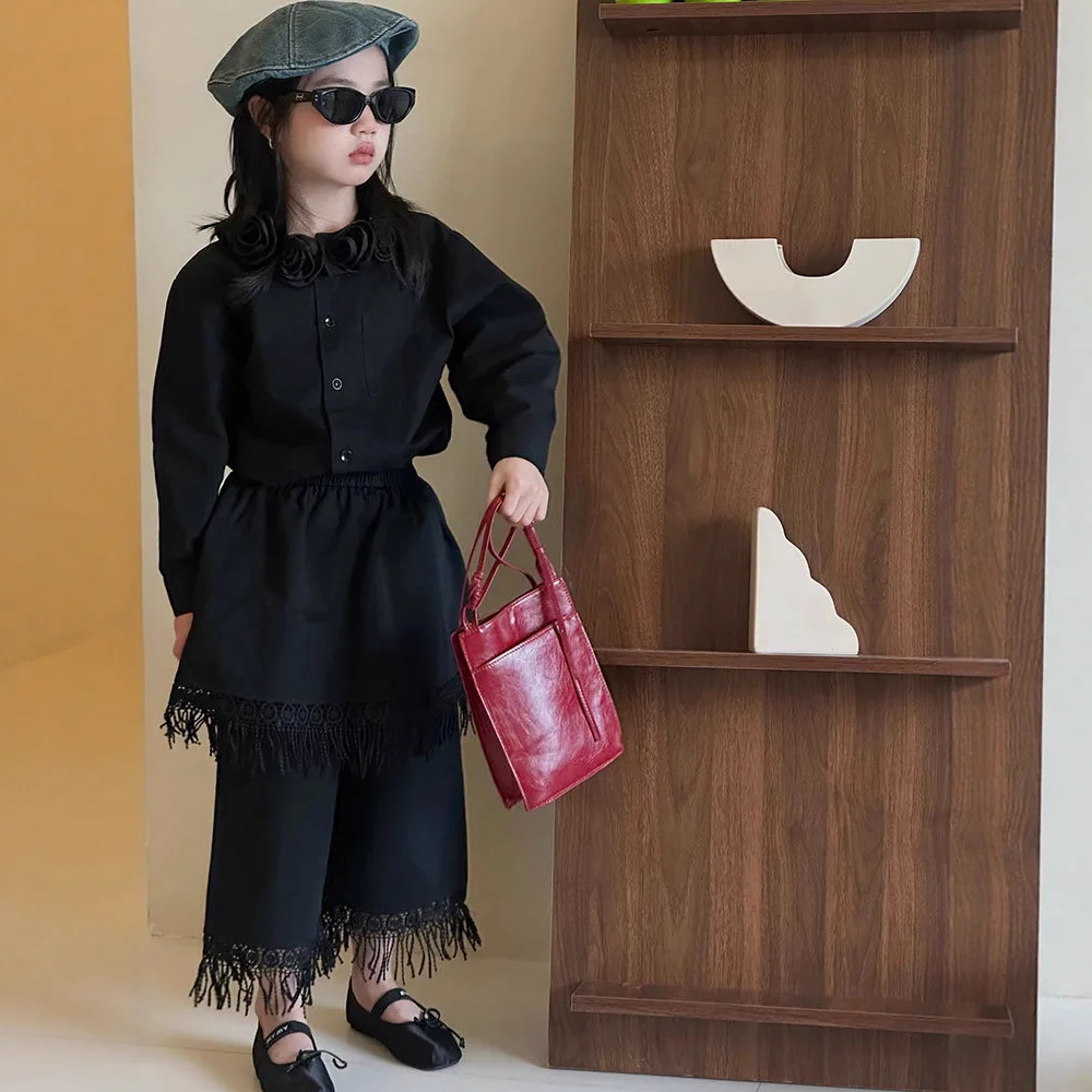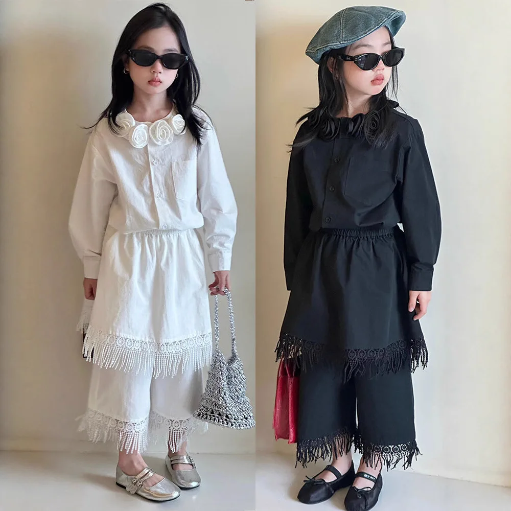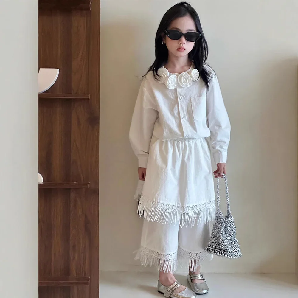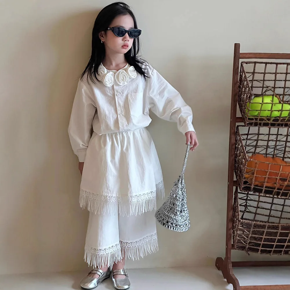 Girls Clothing Set White Elegant Vintage Floral Collar Blouse Fringe Hem Culottes 2-piece Autumn Teen Kids Bohemian Outfits 12 Y