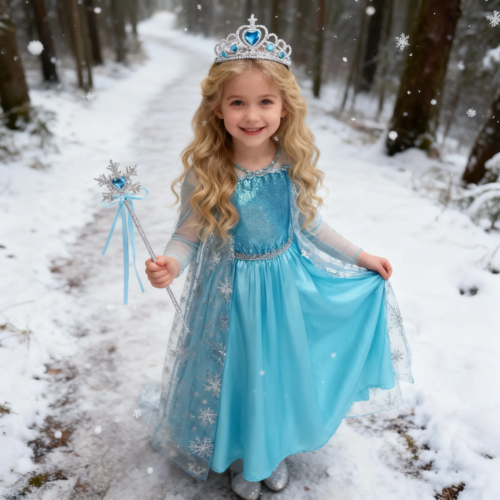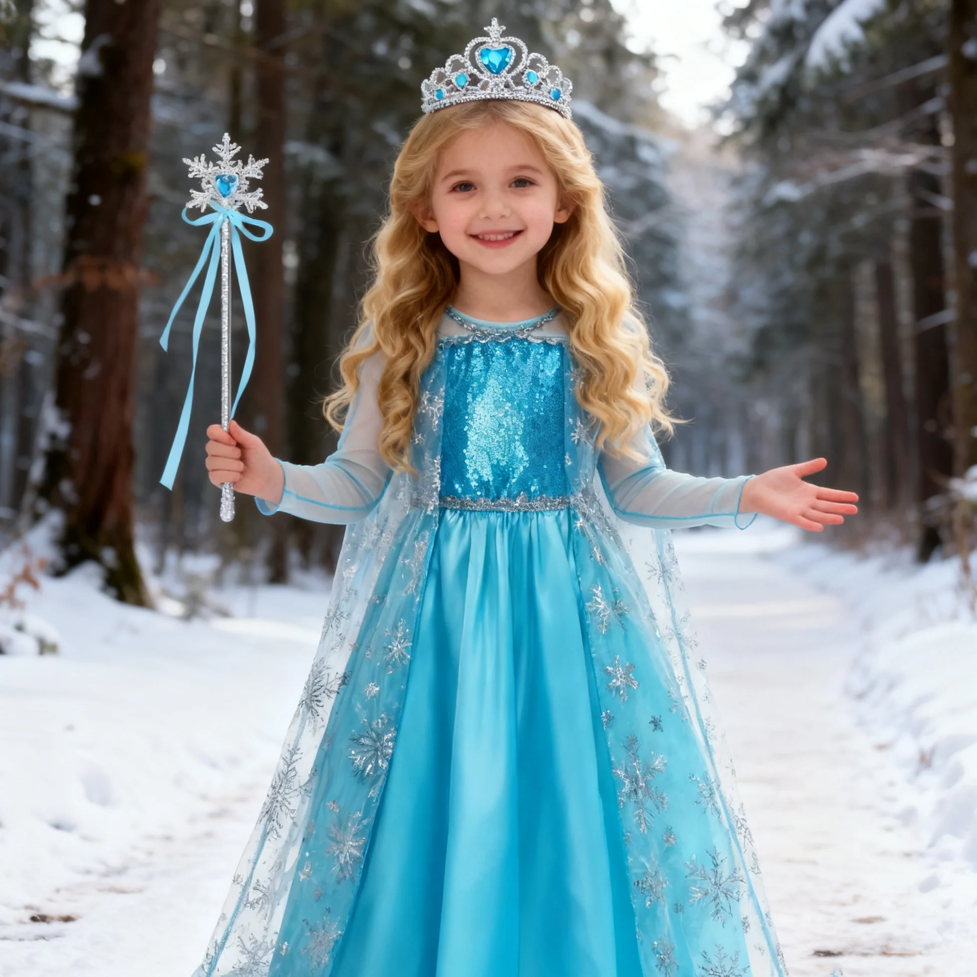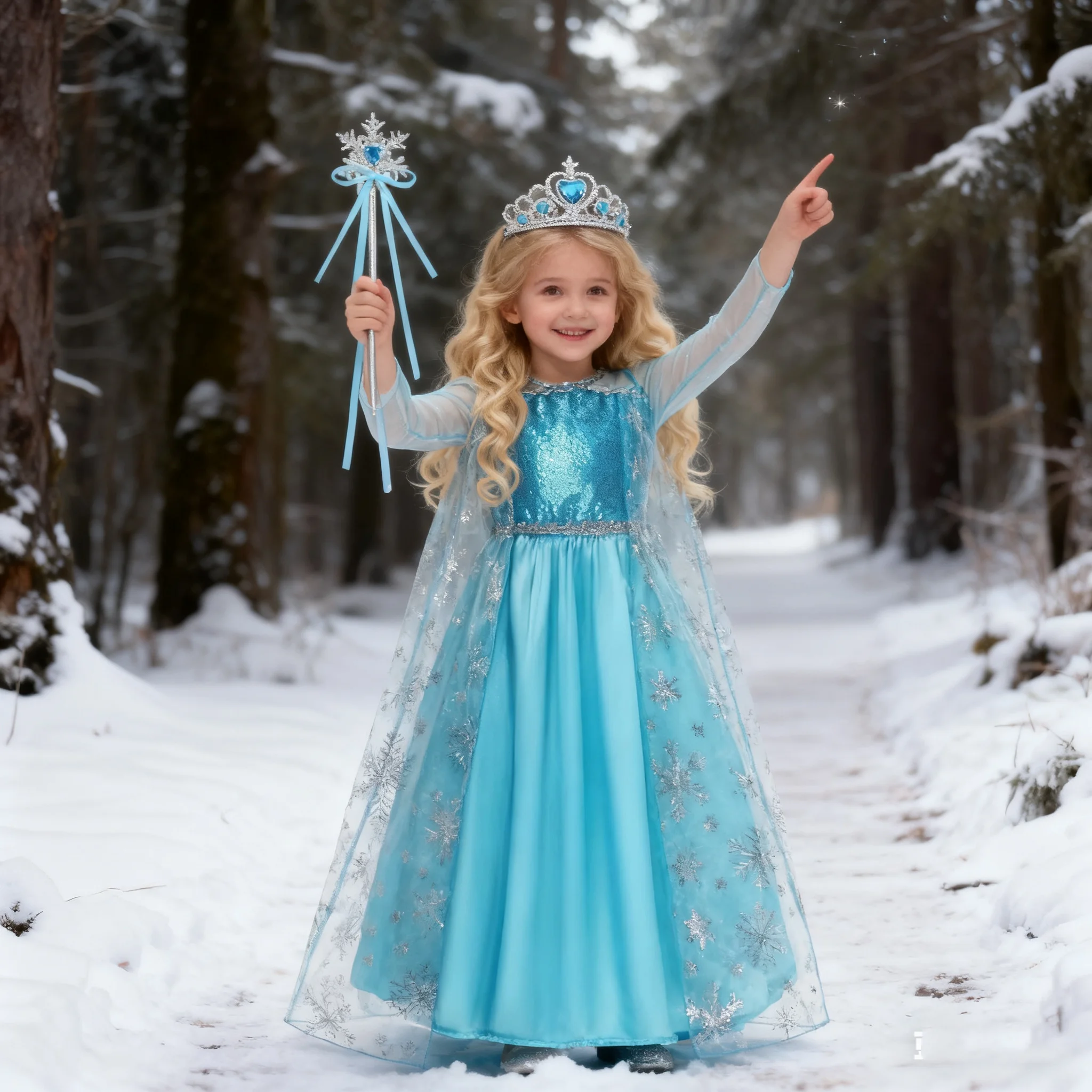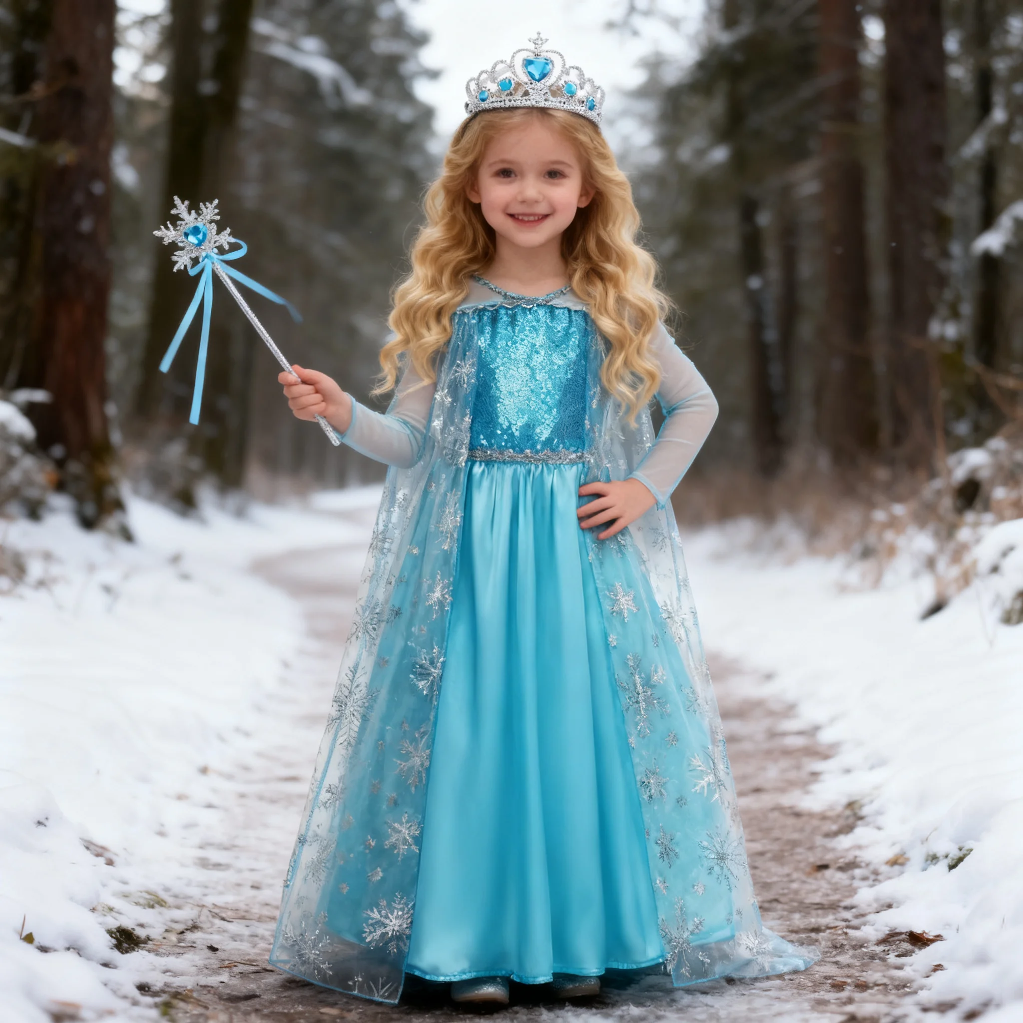 - Complete Elsa cosplay with snowflake cape and accessories.