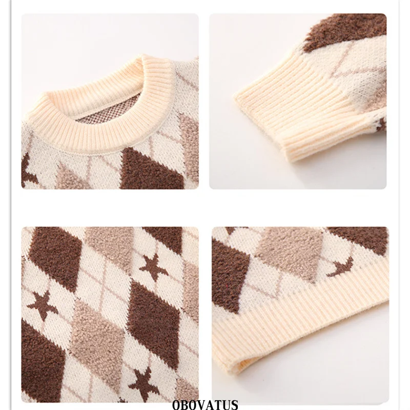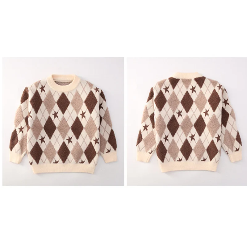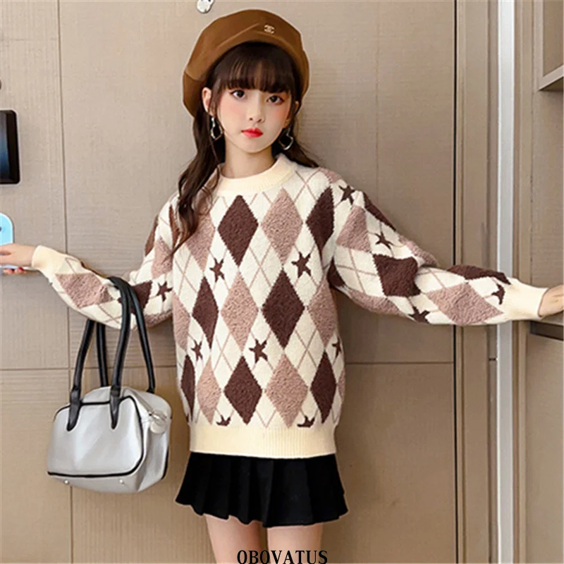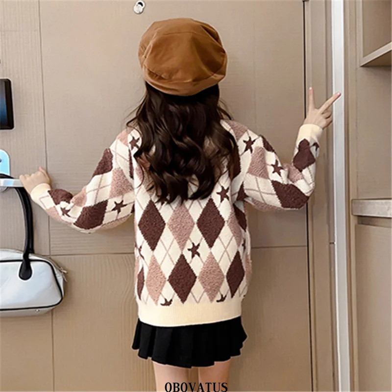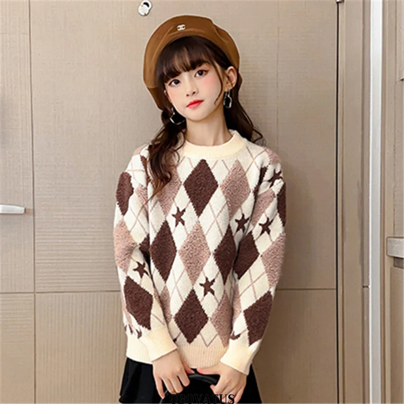 Korean Fashion Girls Rhombus Sweater with Geometry Print Knitwear School Child Casual Spring Knitted Clothing For Kids Princess
