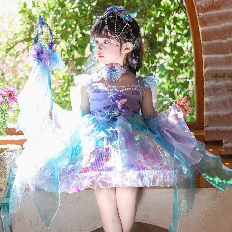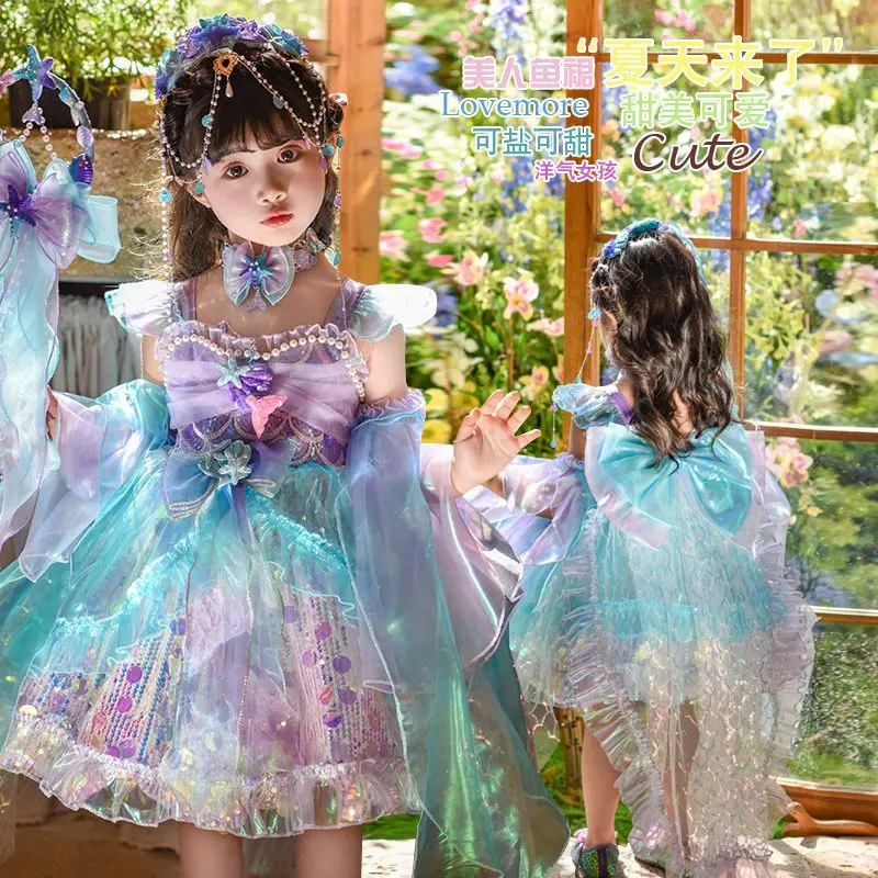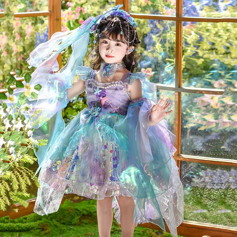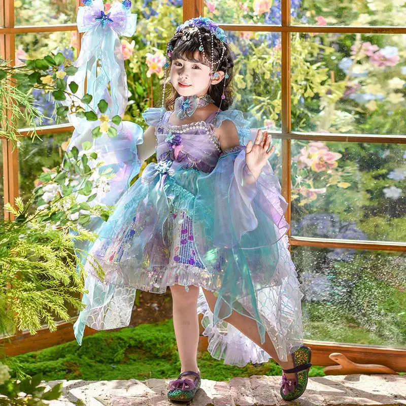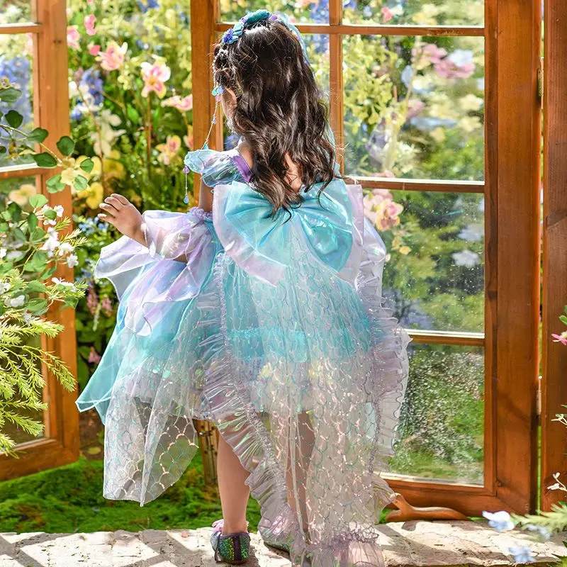 Summer Backless Lolita Ball Gown Dress Girls Kids Sets Princess Shiny Dress Birthday Party Childrens Gauze Clothing Bow Sundress