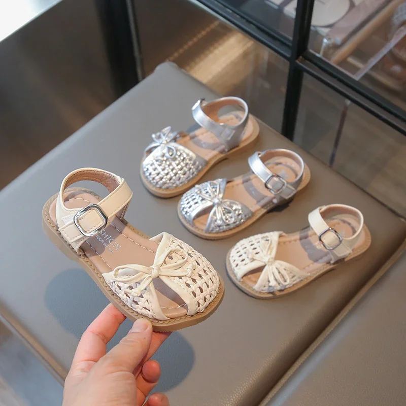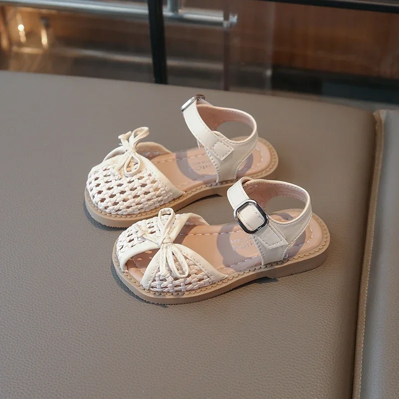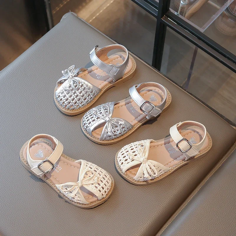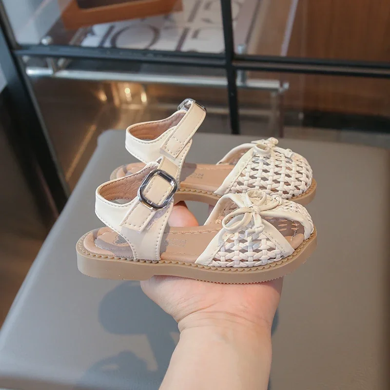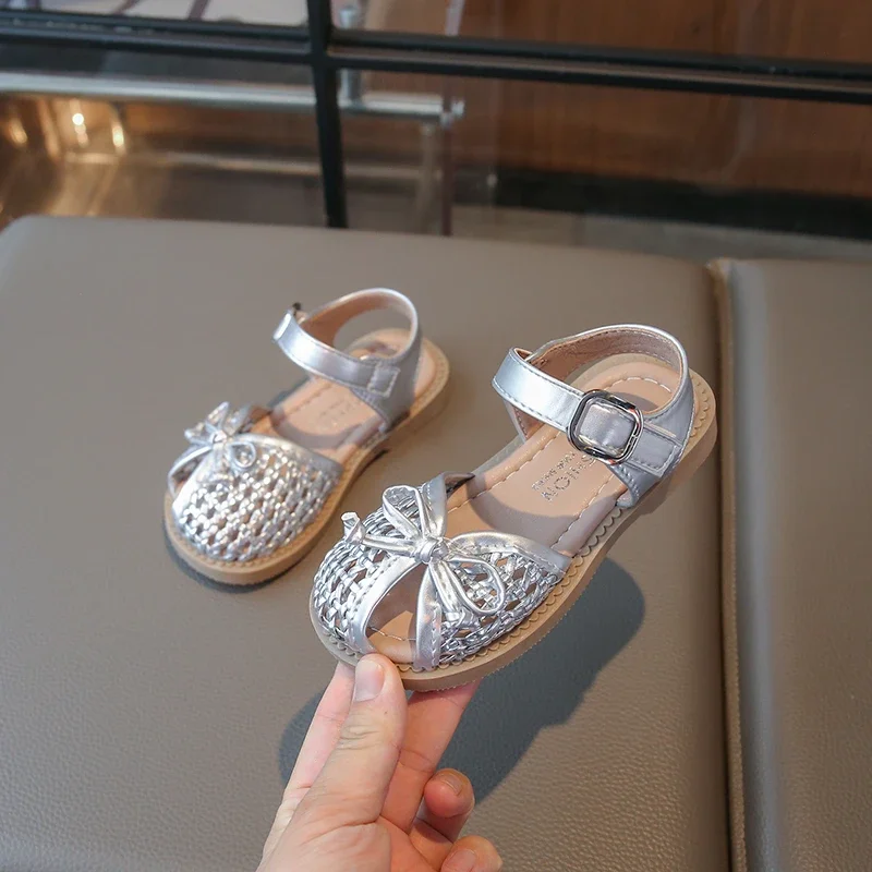 Summer Children New Sandals Woven Style Girls Princess Fashion bowknot Shoes Toes-covered Kids Causal Hollow-out Flat Sandals