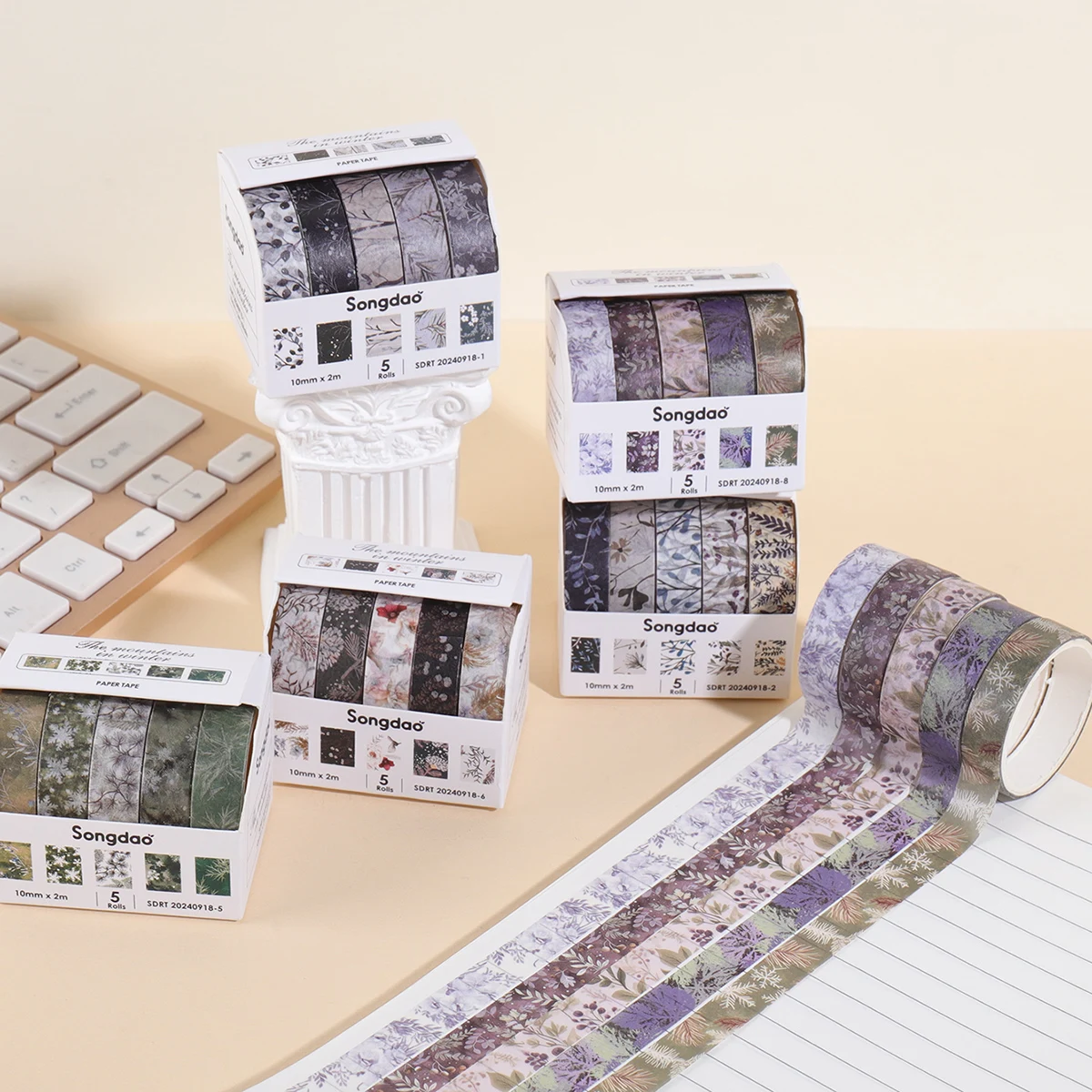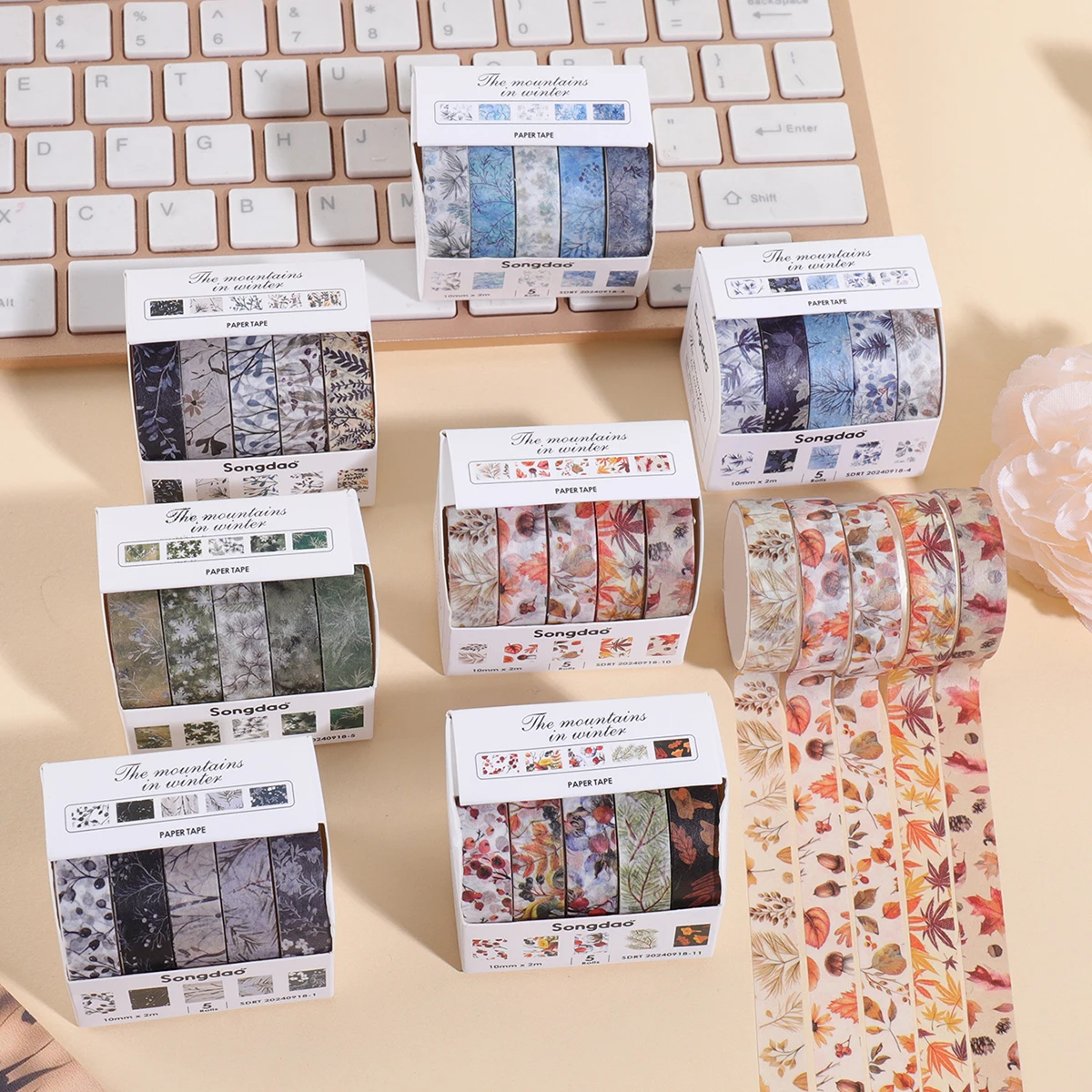 5 rolls/box of winter mountain field themed washi tape, featuring floral,foliage,snowflake patterns,DIY scrapbook collage materi