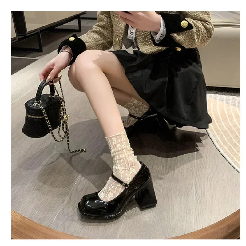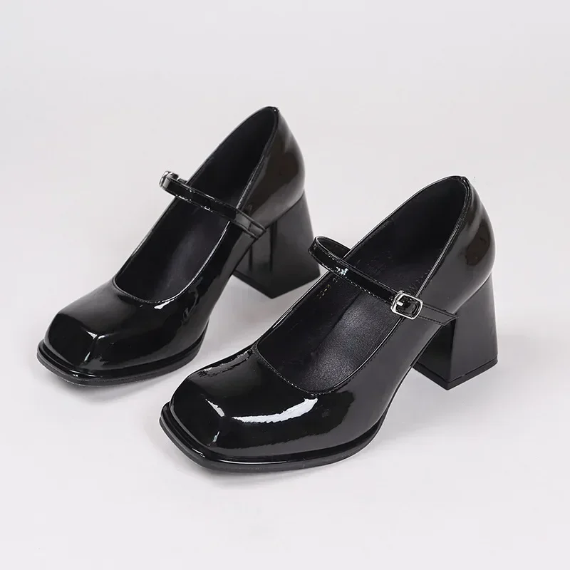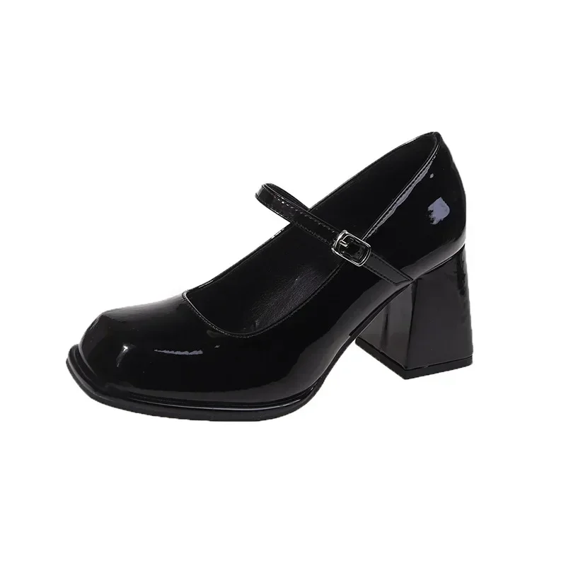 Ladies Summer Black New Small Leather Shoes Mary Janes Vintage Buckle Non-Slip Sandals Woman Medium Heels Casual Elegant Heels