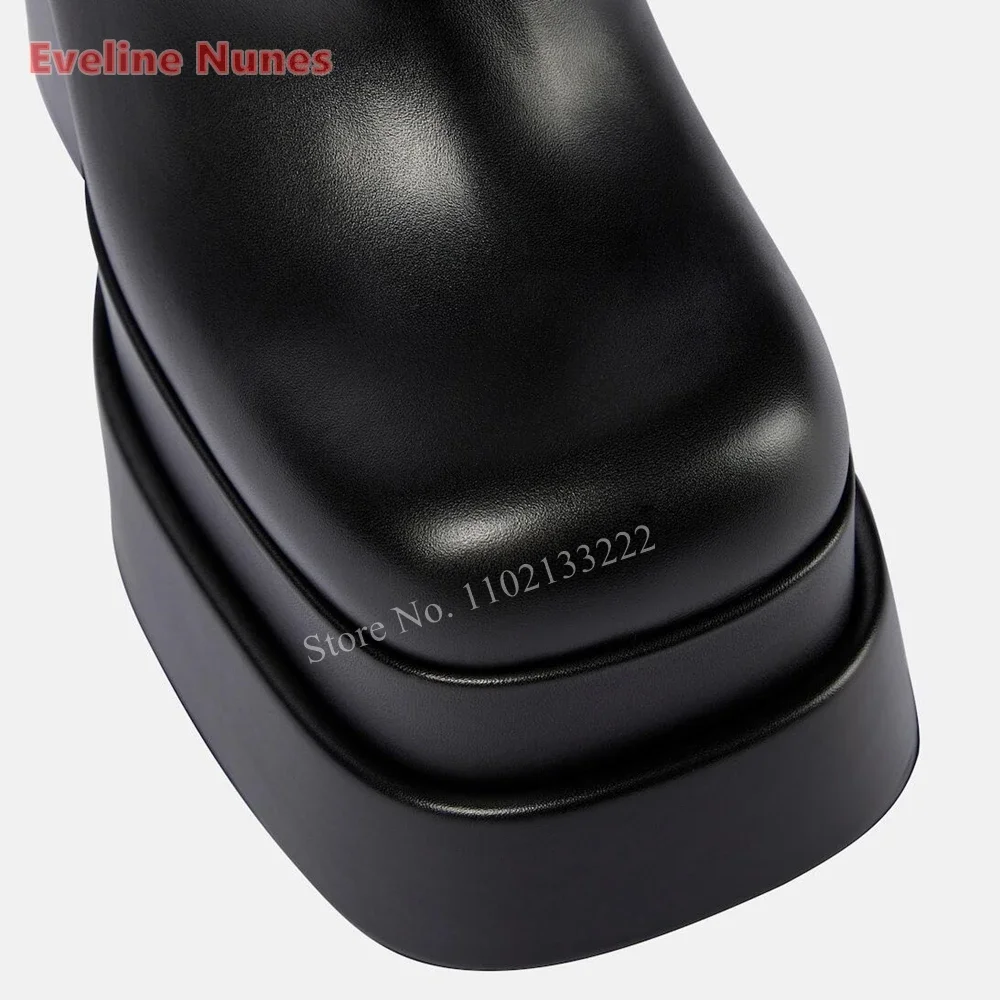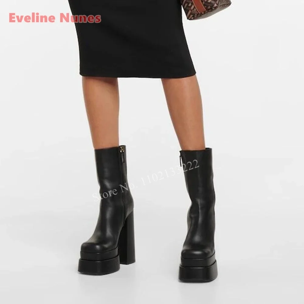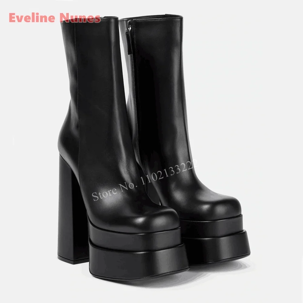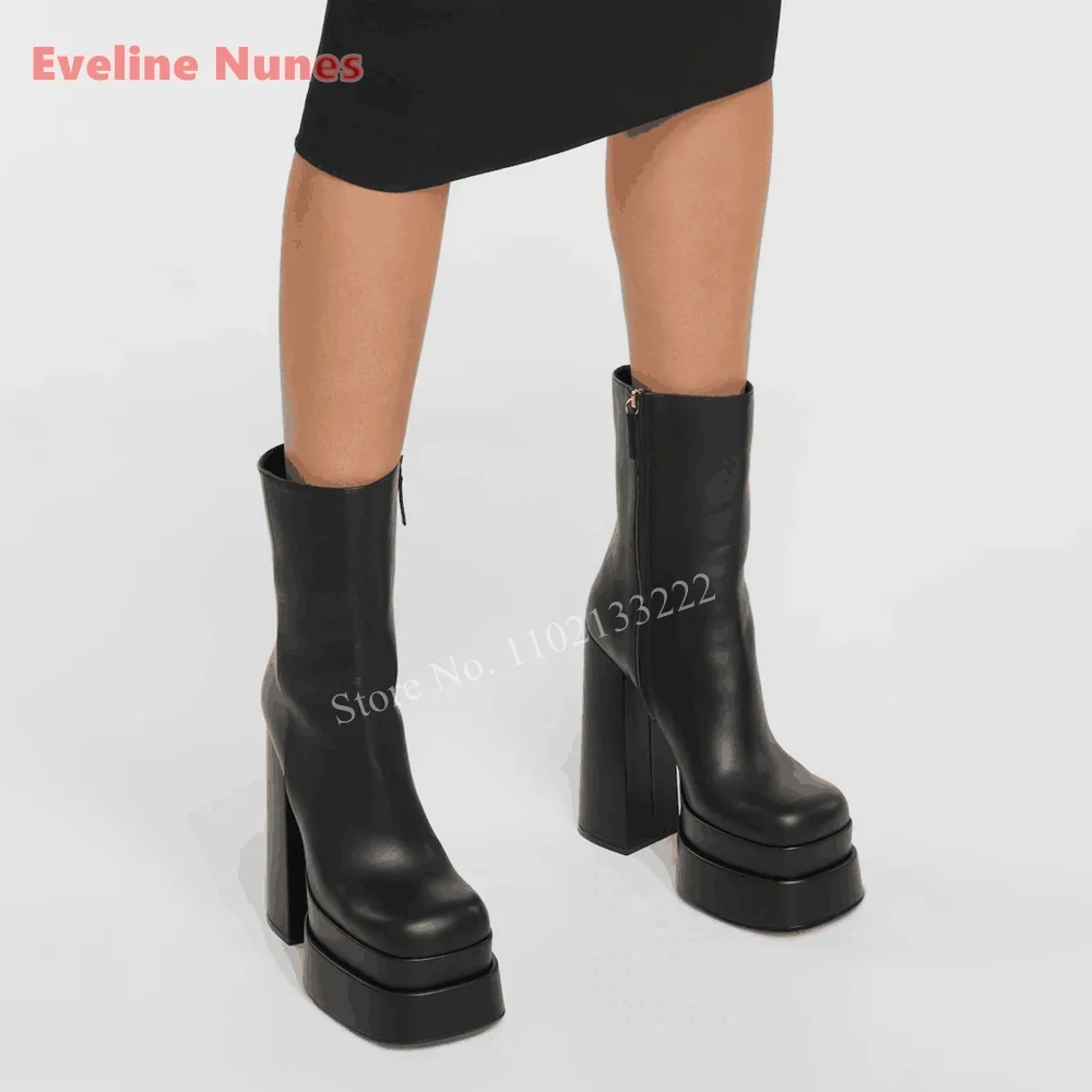 New Black Leather Platform Ankle Boots News Simple Women's Side Zipper Chunky High Heel Round Toe Night Club Anti-slip Shoes