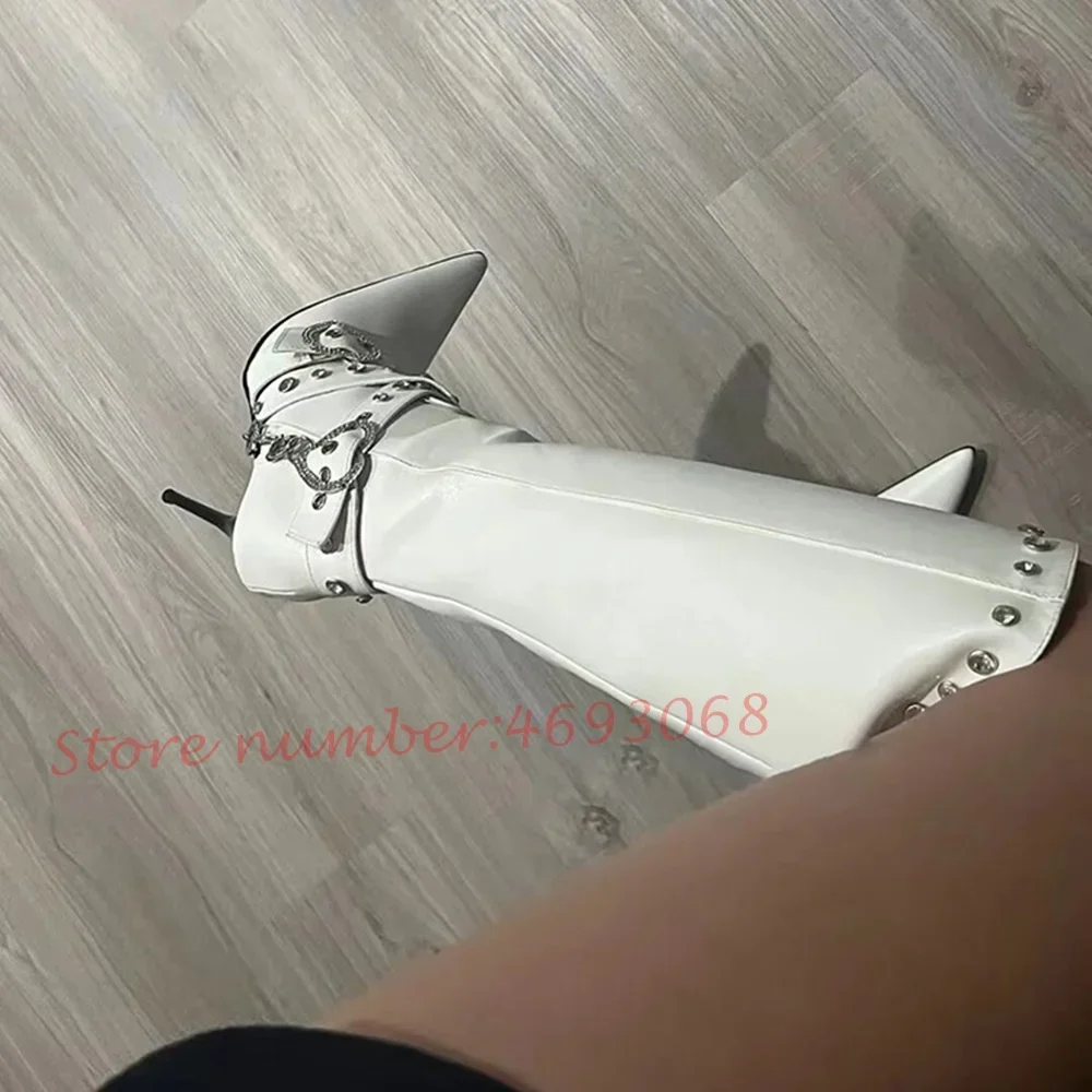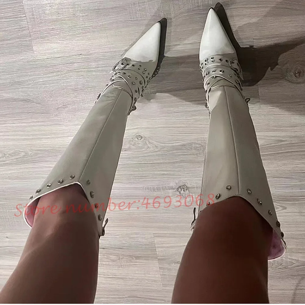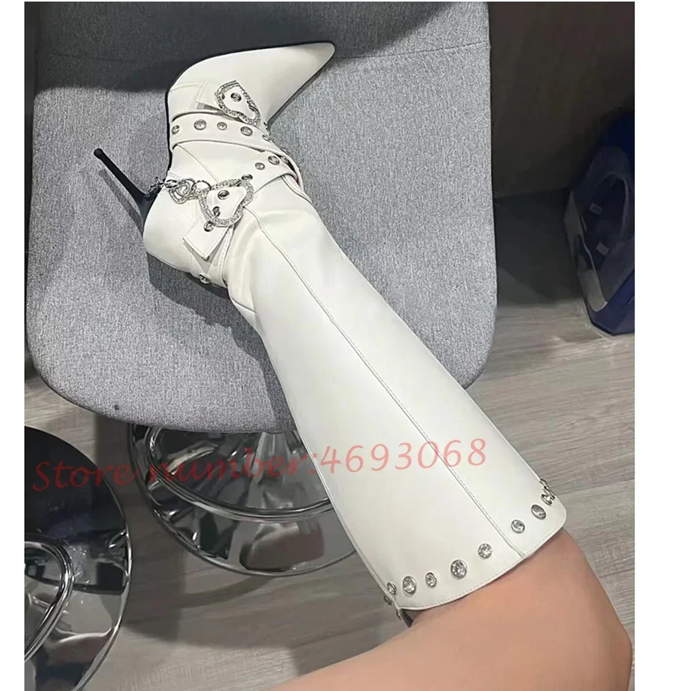 Pointy Hottie Biker Long Boots Women Sexy Crystal Rivets Belt Buckle Stiletto Heels White Boots Winter Outfit Fashion Lady Shoes