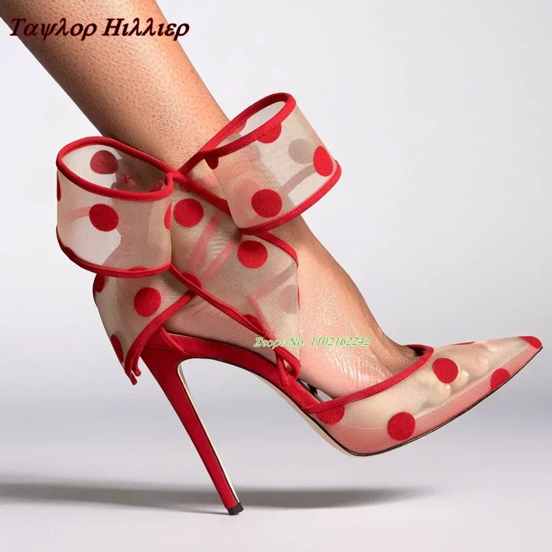 Spotted Breathable Mesh Pumps Big Bow Pointed Stiletto Buckle Strap High Heels Fashion Party Banquet Wedding Pumps For Women 47