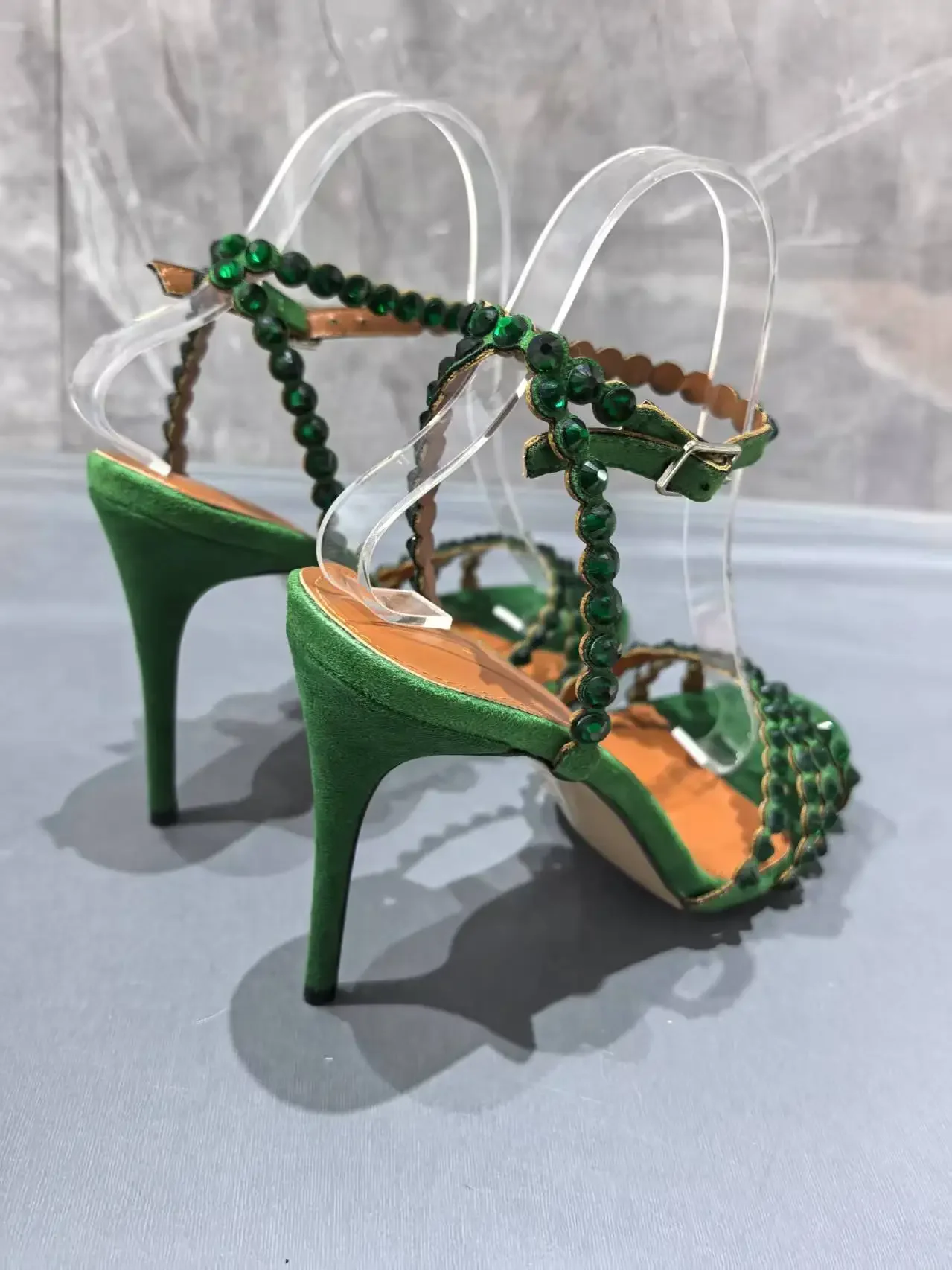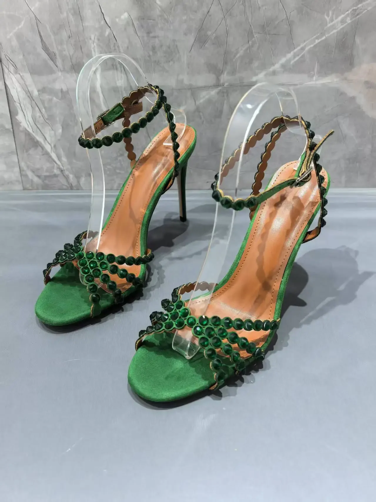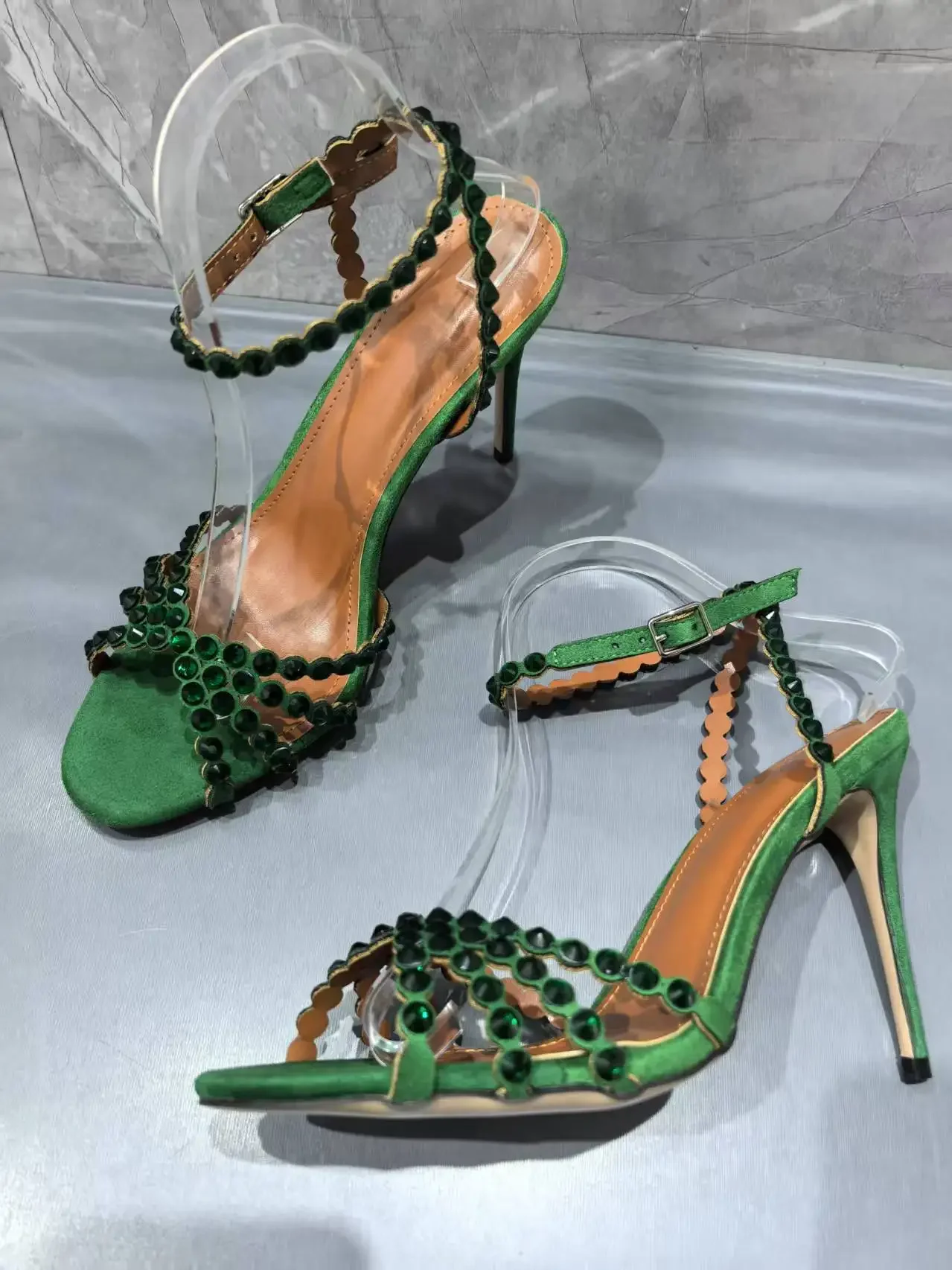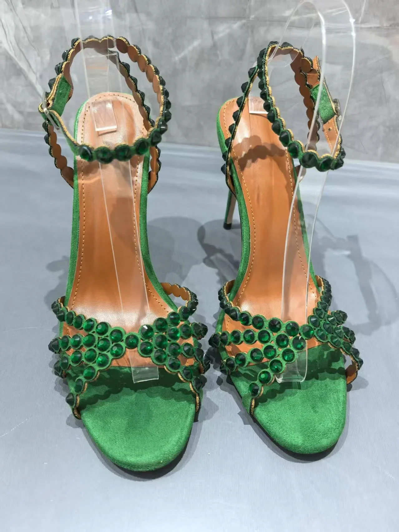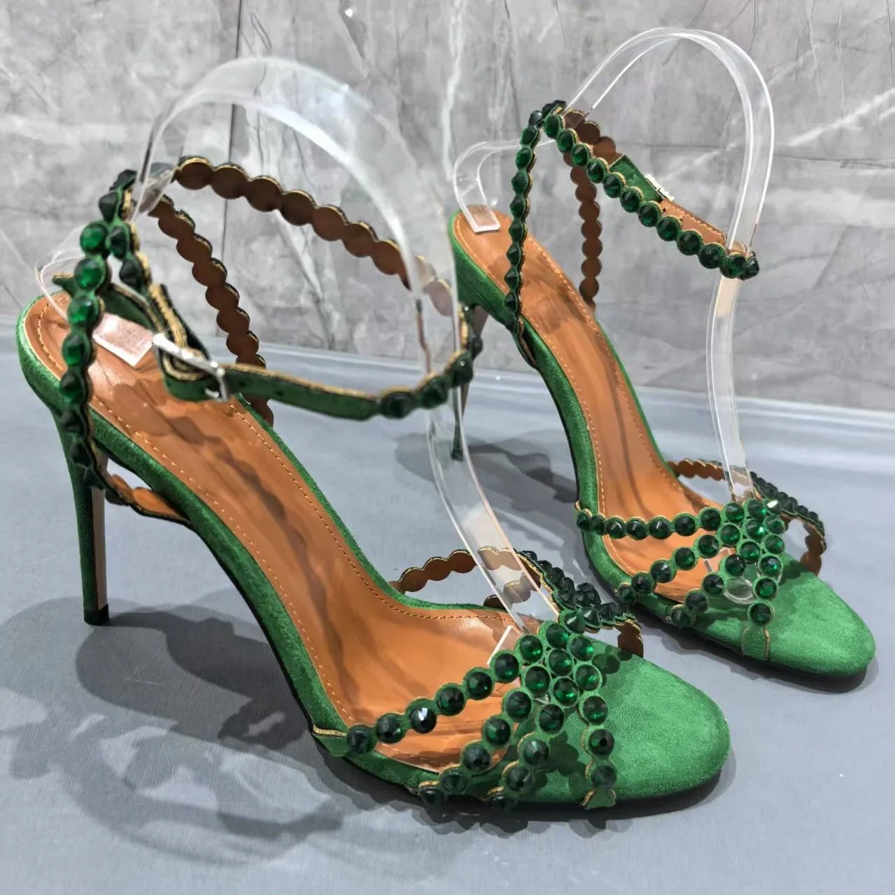 Spring 2025 New Women's Suede High Heels Round Toe Fine Drill Decorative Sexy Elegant Ladies Sandals Banquet Dress Women Shoes