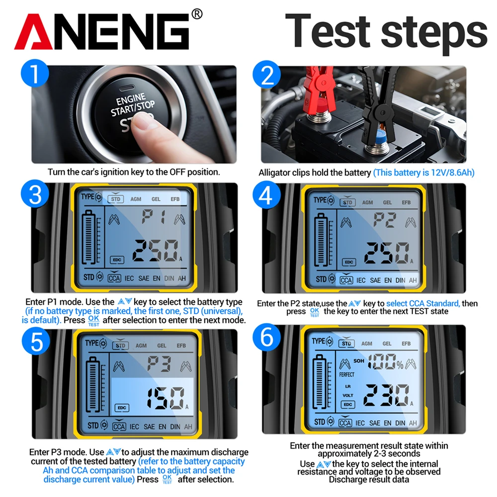 12V 24V Car Battery Tester Digital Automotive Alternator Analyzer Display Screen ANENG BT175 With Insulated Alligator Clip Tools