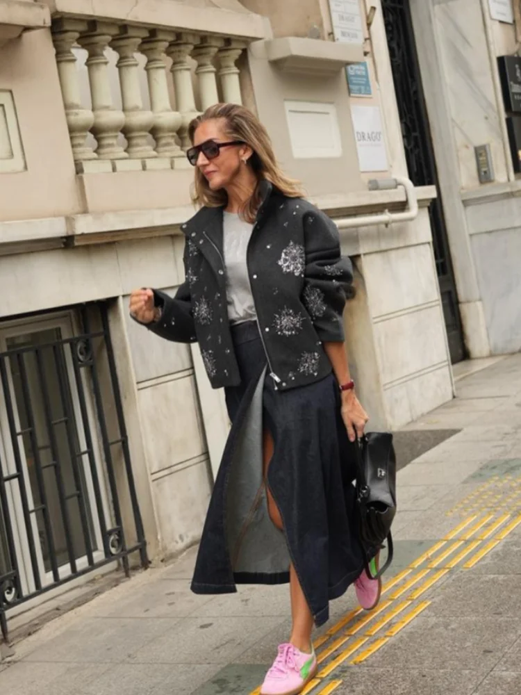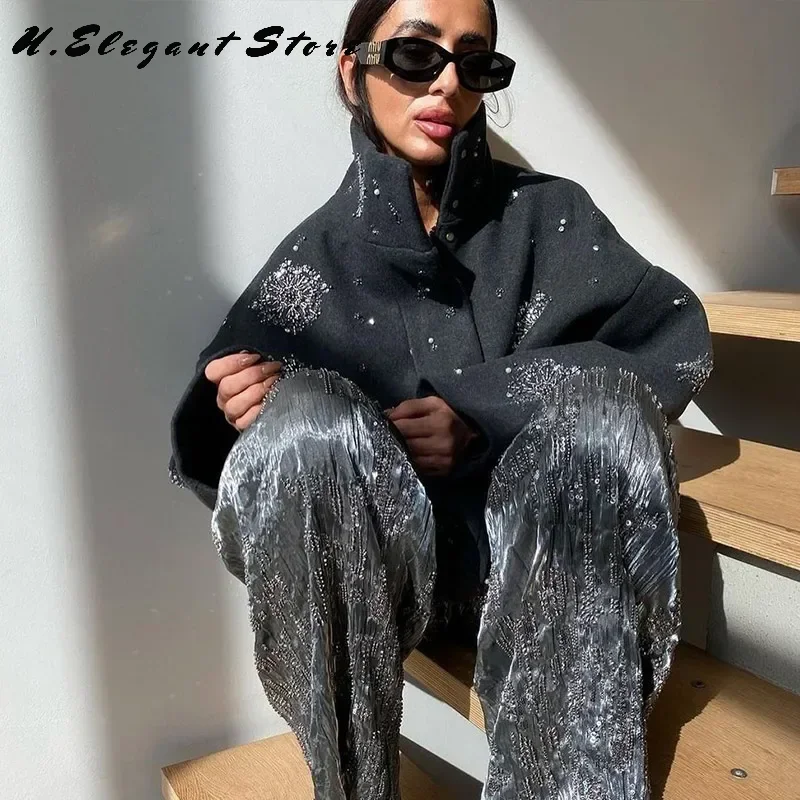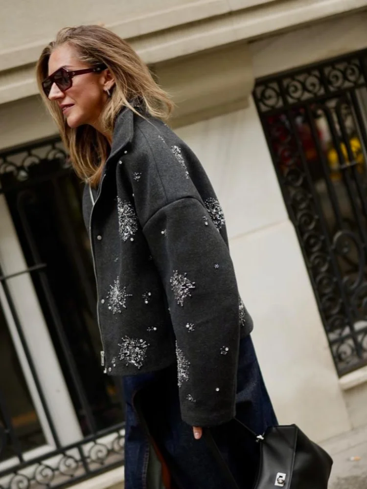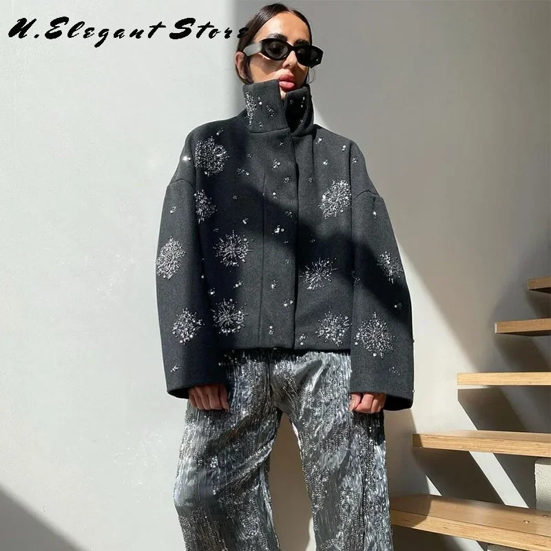 Beading Luxurious Chic Coat Women Loose Single Breasted Stand Collar Pocket Woolen Outwear 2024 Winter Snowflake Sequins Jackets