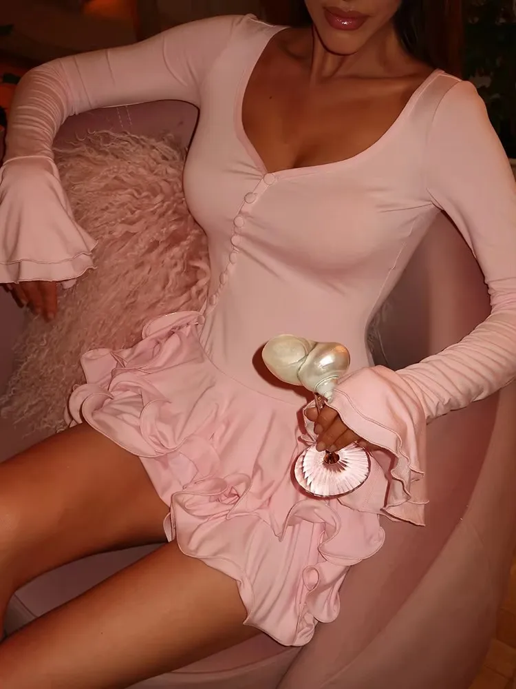 Mozision Flare Sleeve Ruffle Sexy Mini Dress Women Robe Irregular Single-breasted V Neck High Waist Slim A-line Club Dress