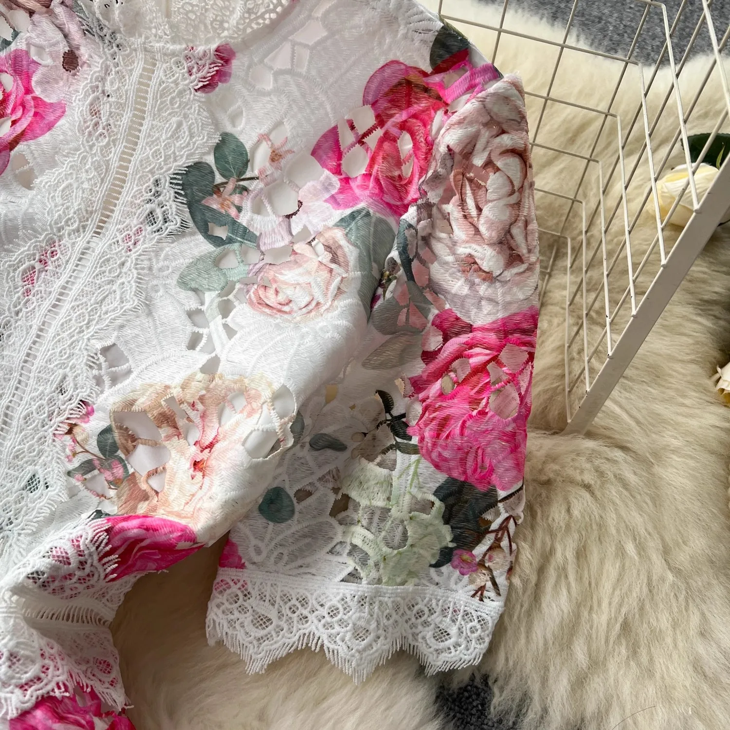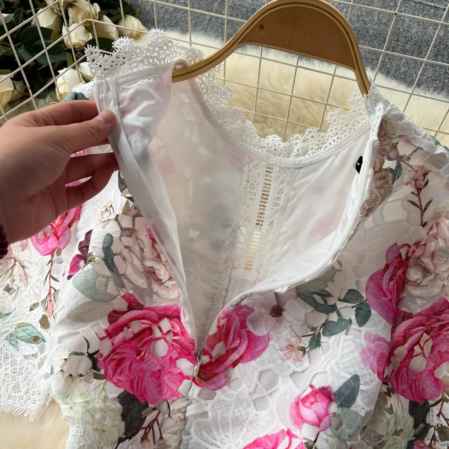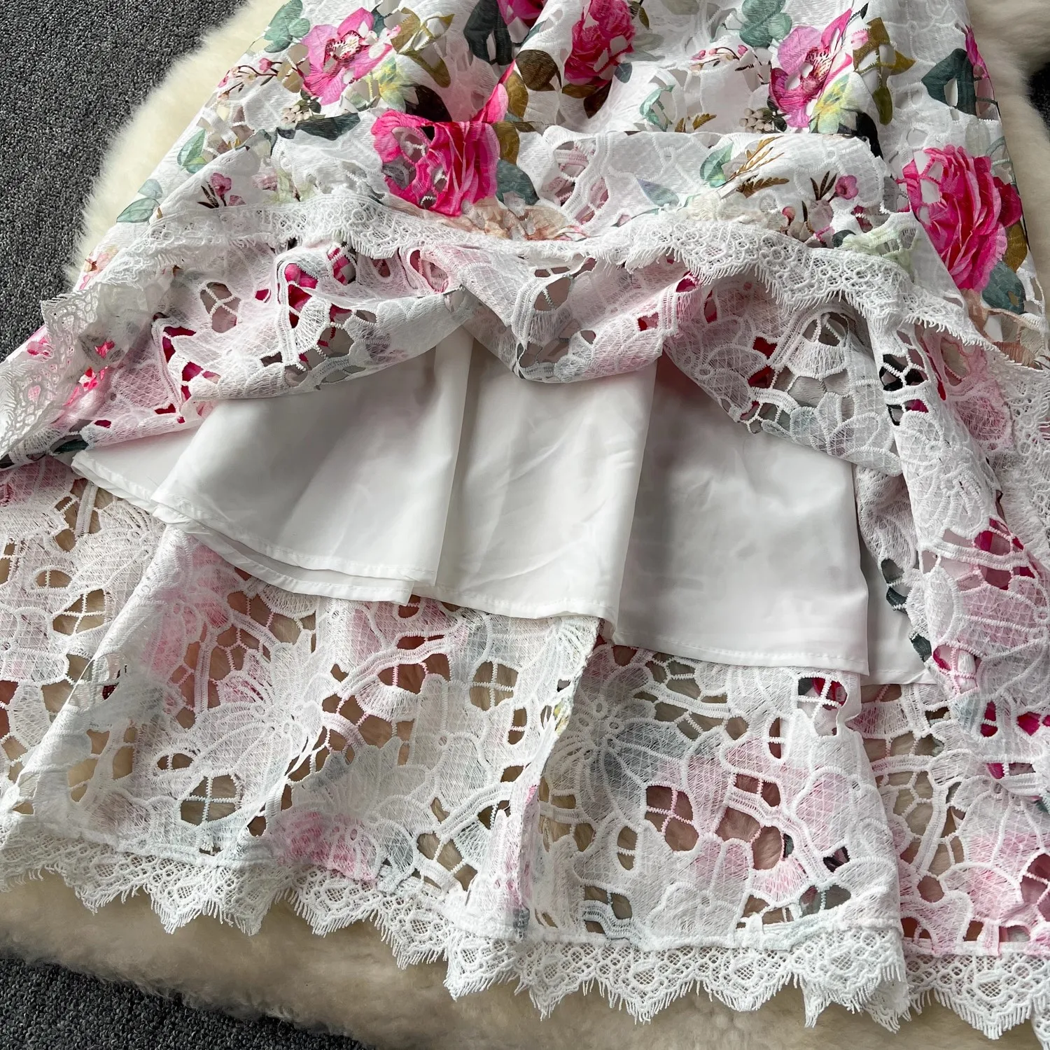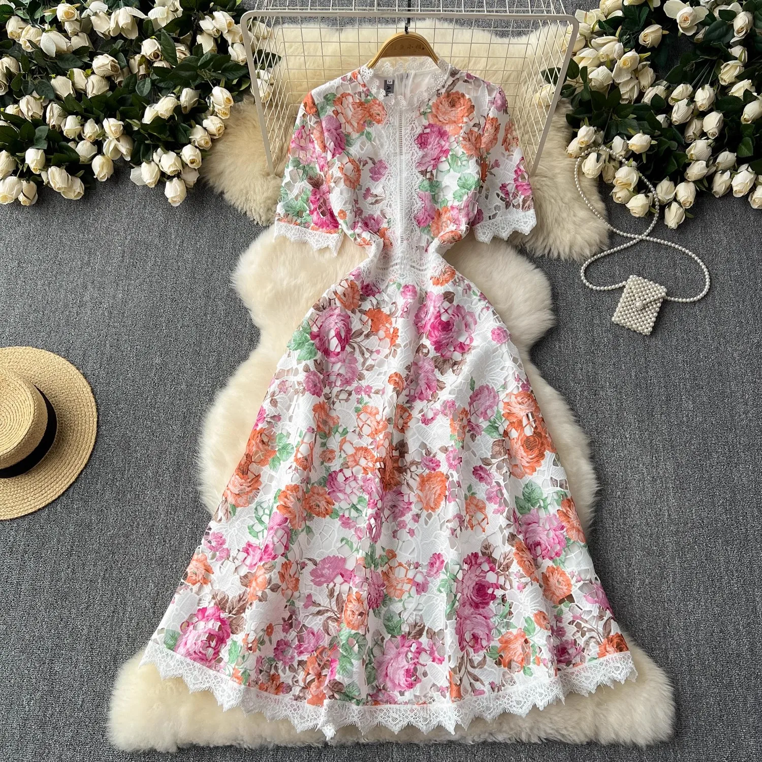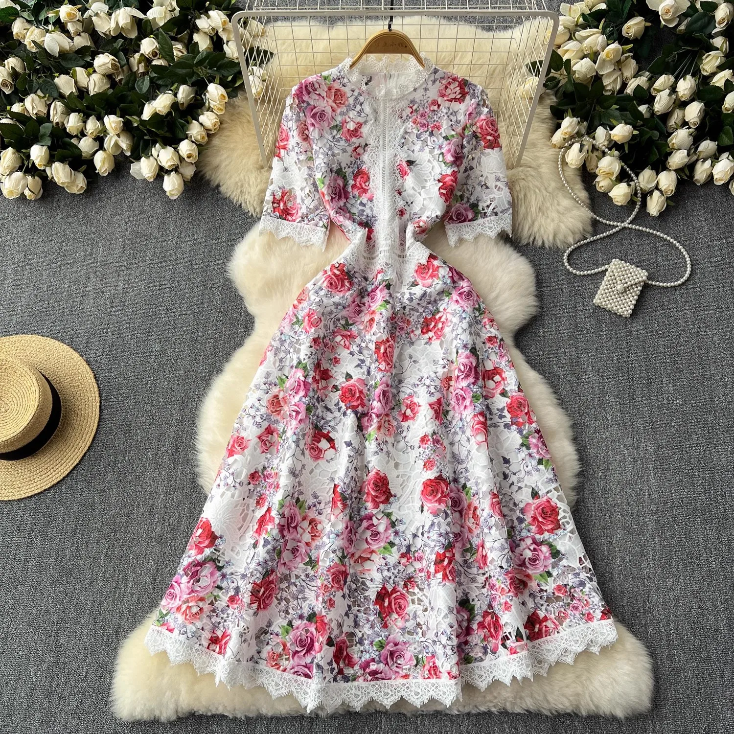 Runway Summer Flower Embroidery Crochet Lace Evening Prom Holiday Dress Women Short Sleeve Lace Patchwork Midi Vestidos 6949