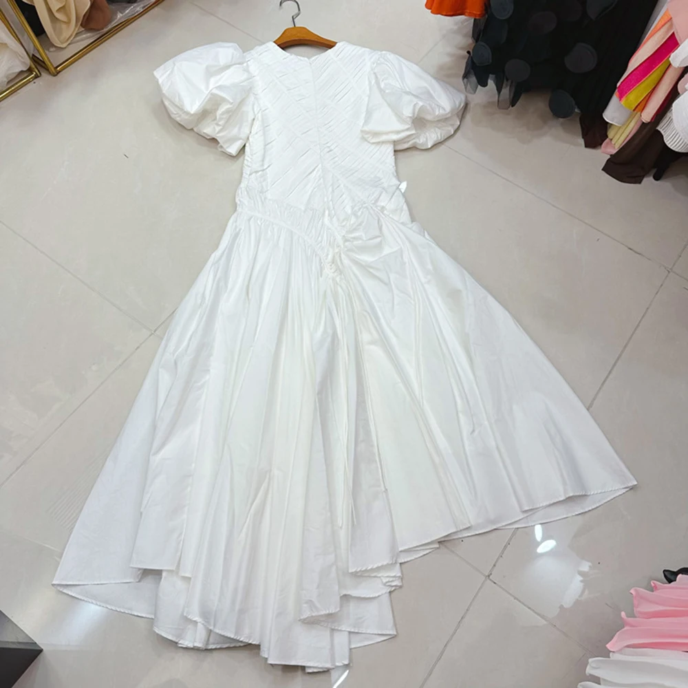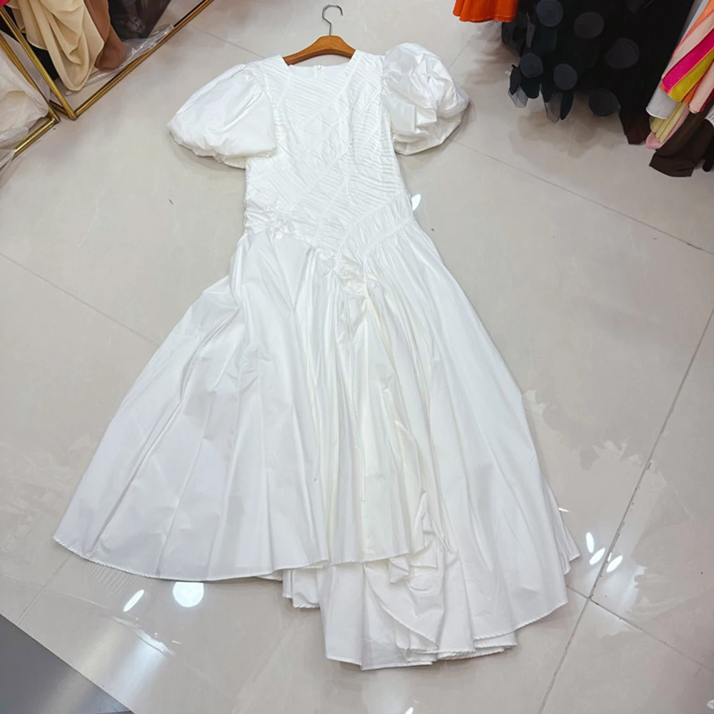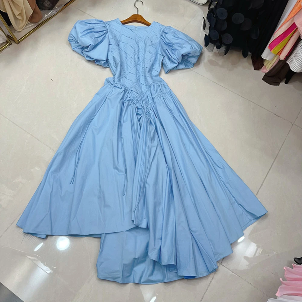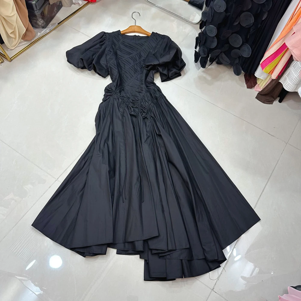 TWOTWINSTYLE Temperament Solid Dresses For Women Round Neck Bubble Sleeve High Waist Casual Folds Dress Female Style KDR538273