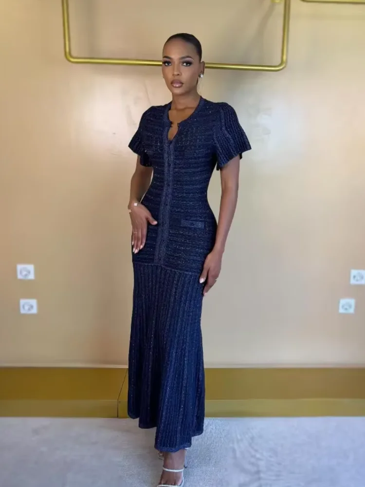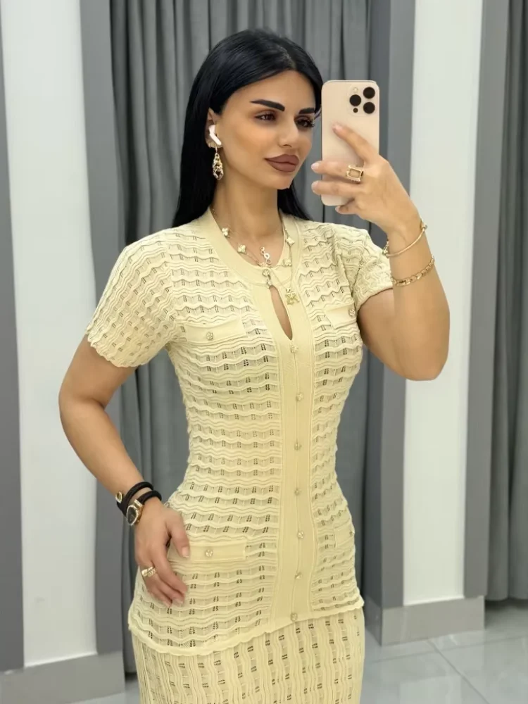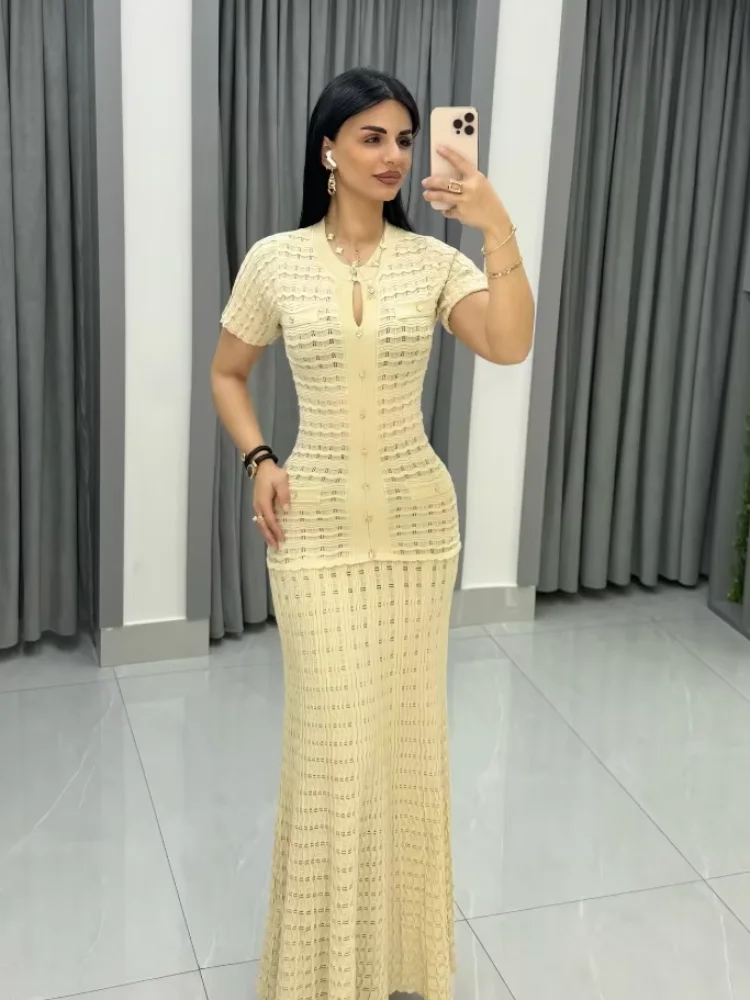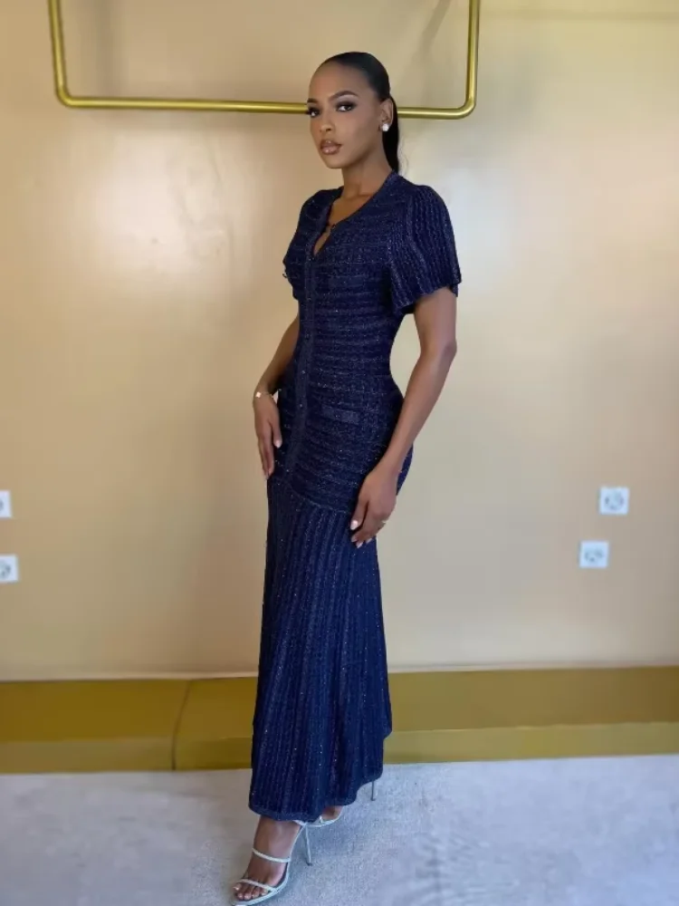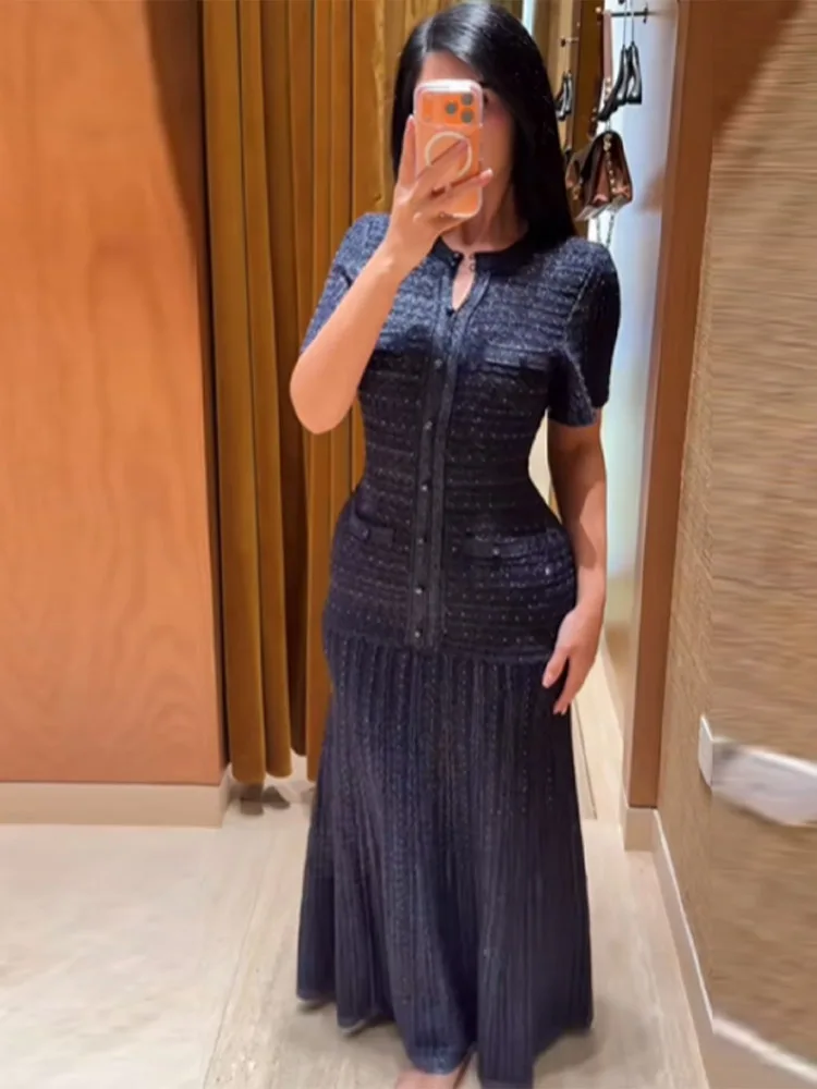 Vintage Textured Sequin Midi Dress Fashion Short Sleeve Button Front Pleated Hem Gown Office Wedding Guest Dress Women Clothing