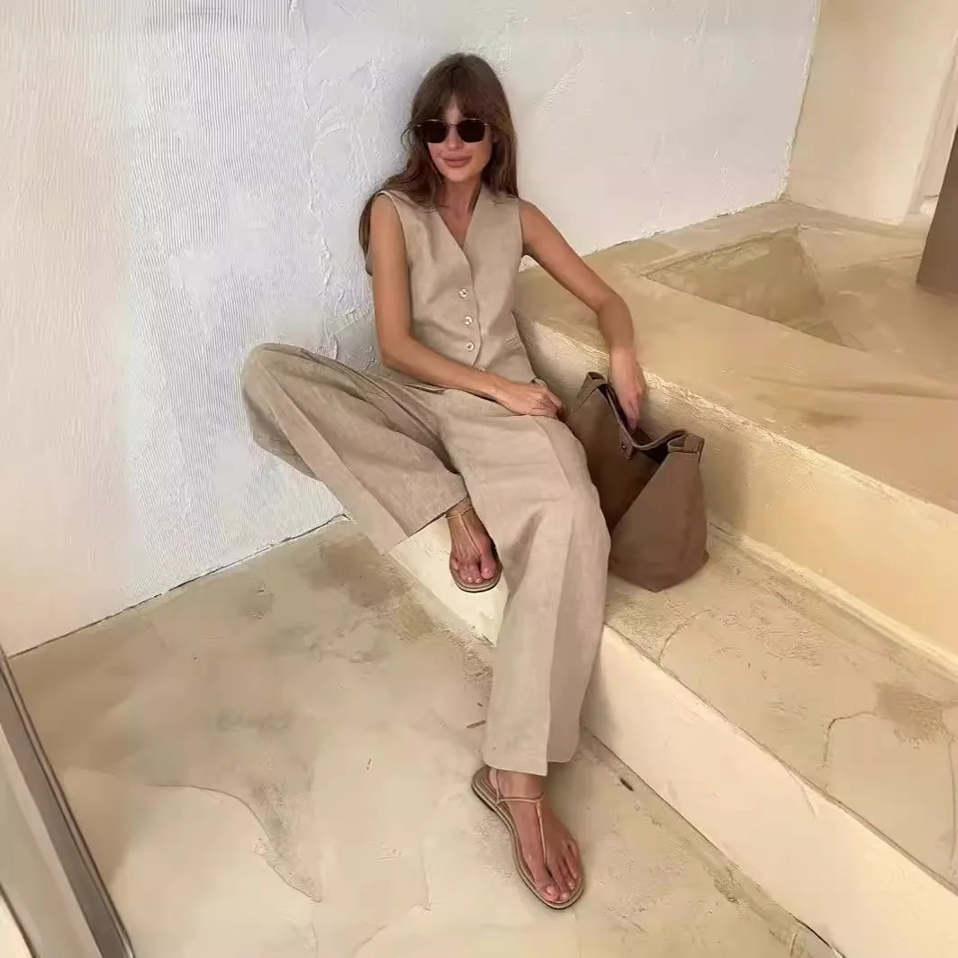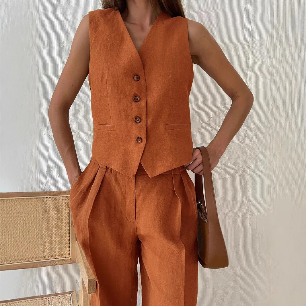 2025 New Women Linen Cotton Chic Vest & Pants Suit Two-Piece Set Office Ladies Summer Chic 2 Piece Sets Women's Outfits