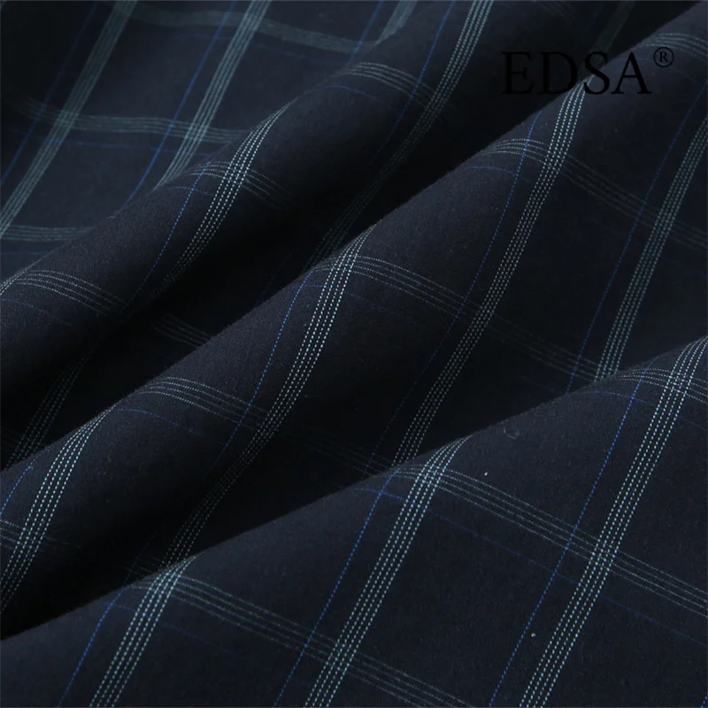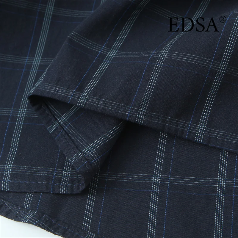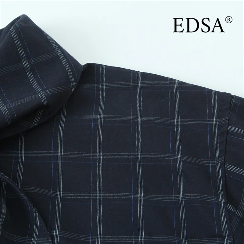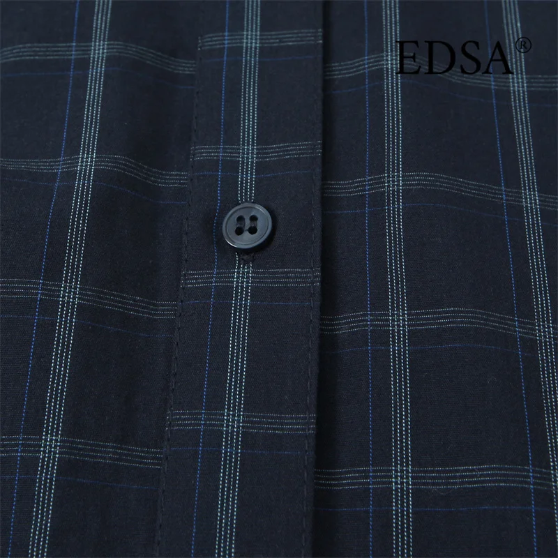 EDSA Women Navy Blue Plaid Shirt with Pocket Square for Office Lady Single Breasted All-Match Tops