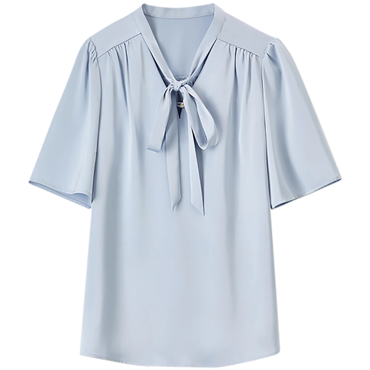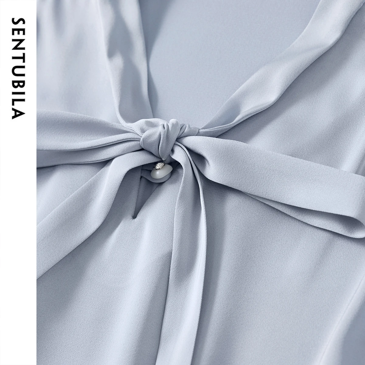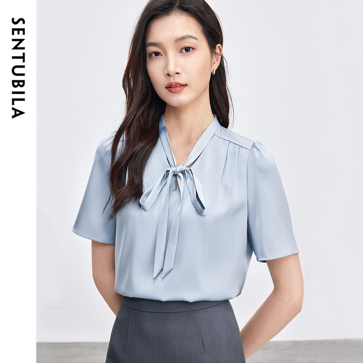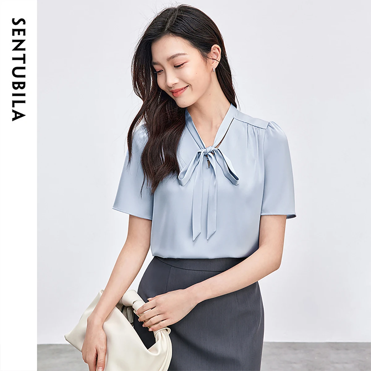 SENTUBILA Chiffon Women Blouse 2026 Short Sleeve Lace-up Neck Elegant Office Lady Commuting Shirt Female Clothing 152V58359