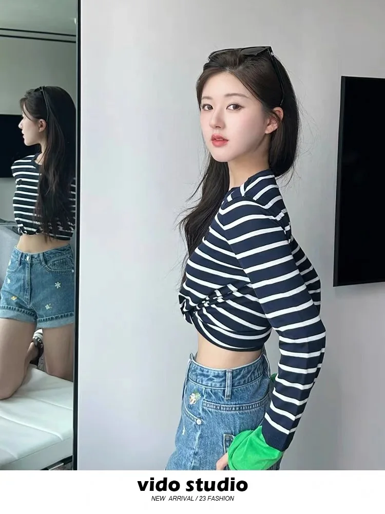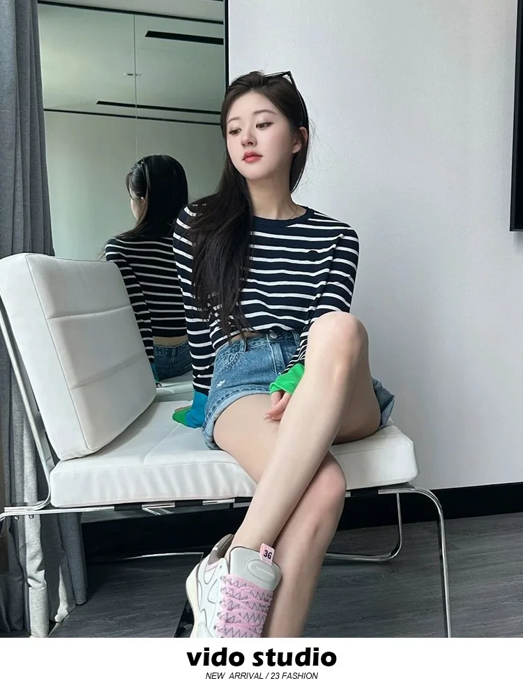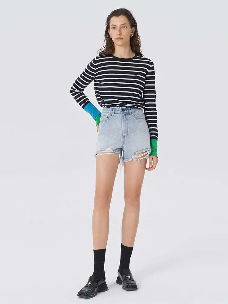 Autumn New Contrast Stripe Shoulder Long Sleeve Knitted T-shirt Women's Round Neck pullover Slim-fit bottoming shirt