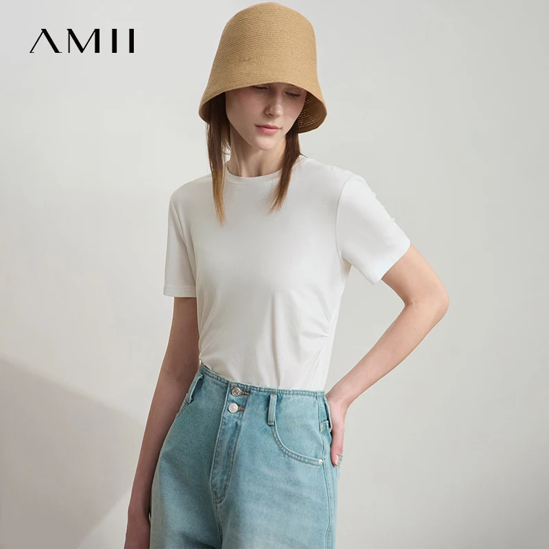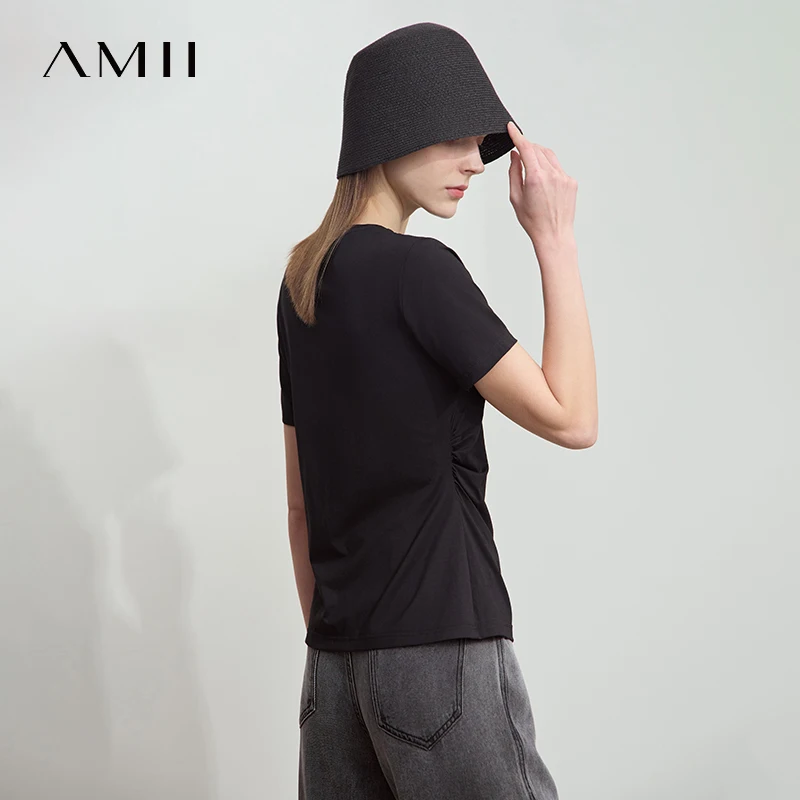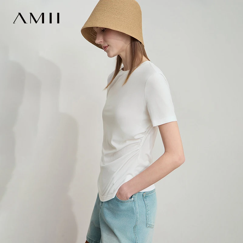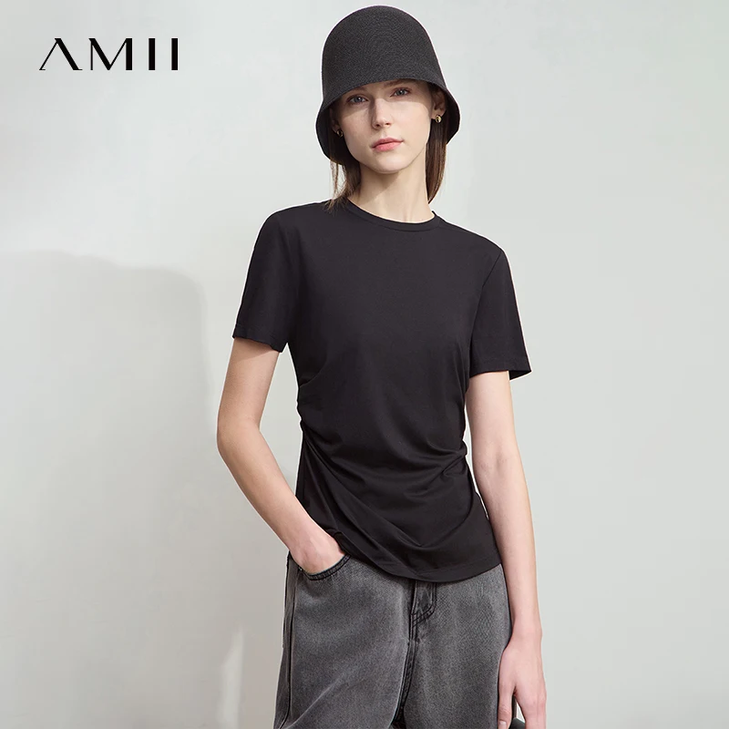 Amii Minimalist T-shirt Women's Tops Round Neck Broken Pleats Slightly Cinched Waist Cotton Knit Antibacterial T-shirt 12522045