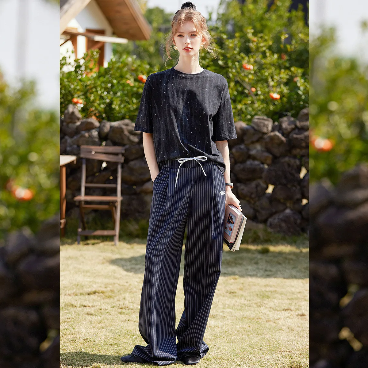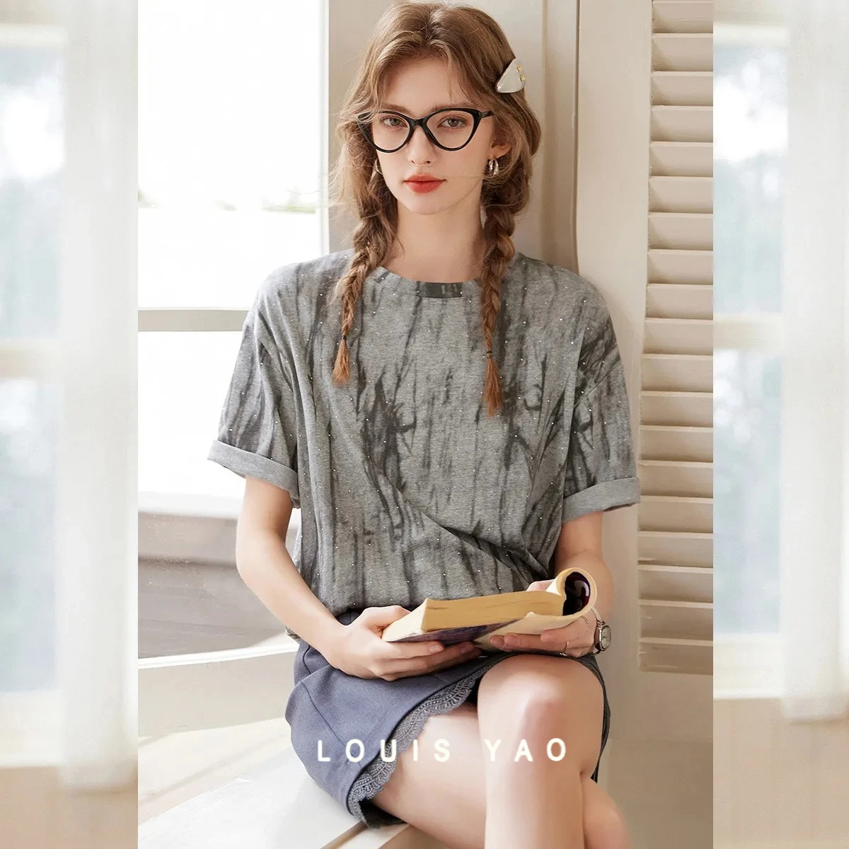 LOUIS YAO Women's T-shirt 2025 Summer Casual Round Neck Color-Contrasting Loose Short Sleeve Textured Layered T-shirt