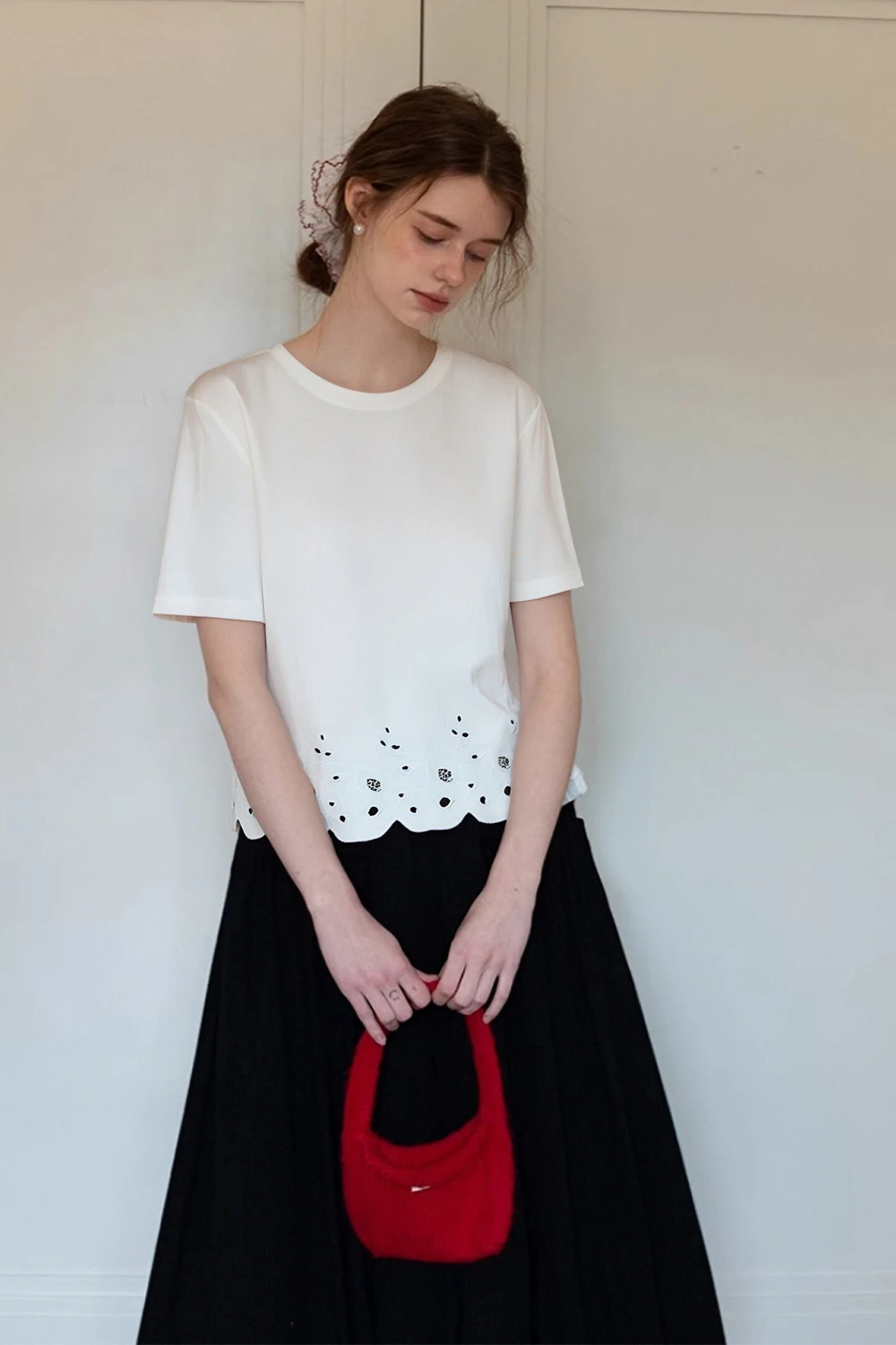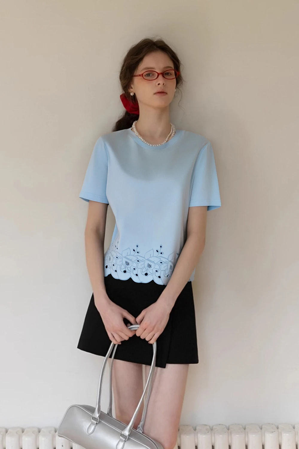 VIMLY Women's Office Casual T-shirt 2026Summer Simple Short Sleeve T-shirt with Hollow Embroidered at Hem Pullover Basic Tee Top