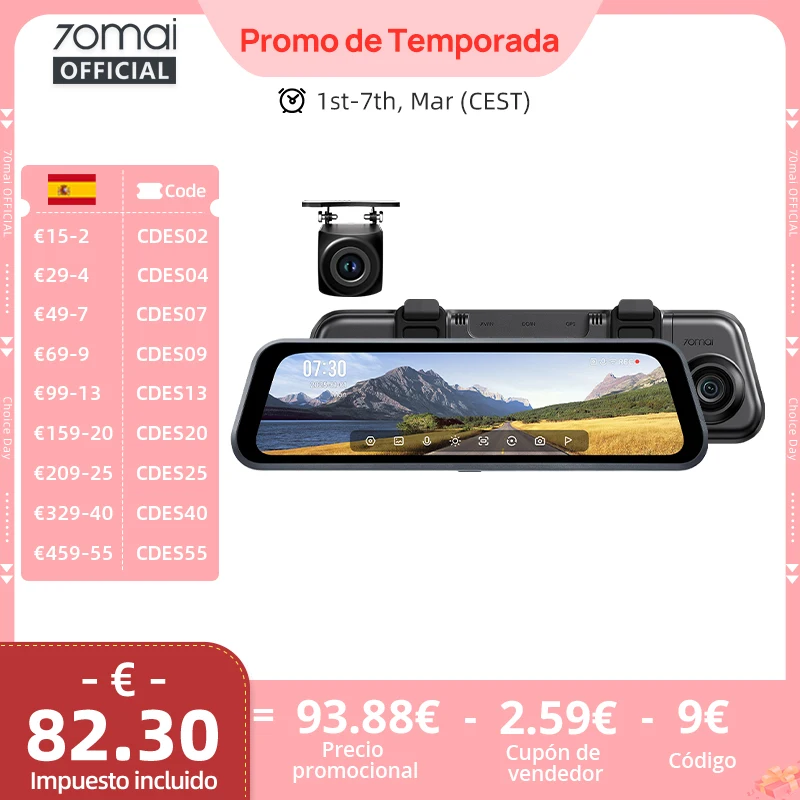 Cámara de Visión Trasera para Coche 70mai S410, Pantalla de Espejo de 9.35 Pulgadas, Delantera 2K, Trasera 1080P, Apertura F1.55, Supercondensador, Protección 24/7, 70mai S410