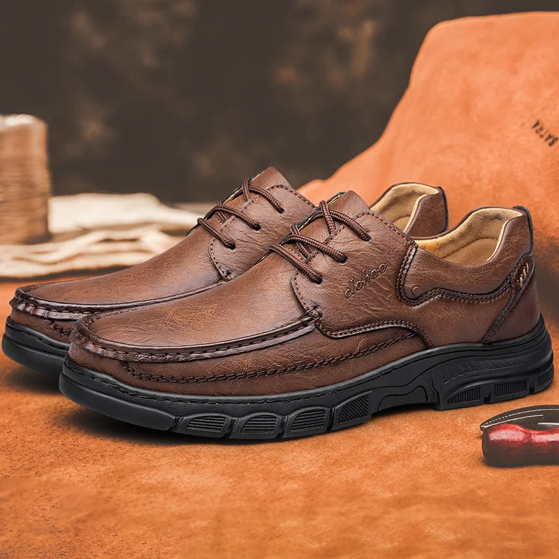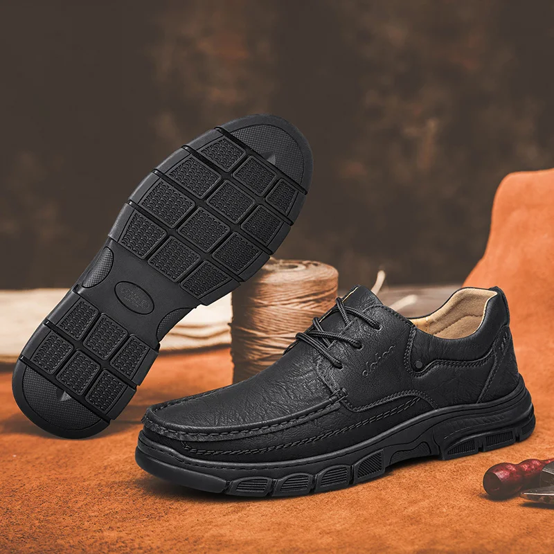 CLOHOO, zapatos de cuero informales transpirables con parte inferior de goma gruesa hechos a mano para hombre, mocasines cosidos clásicos, calzado de ocio cómodo