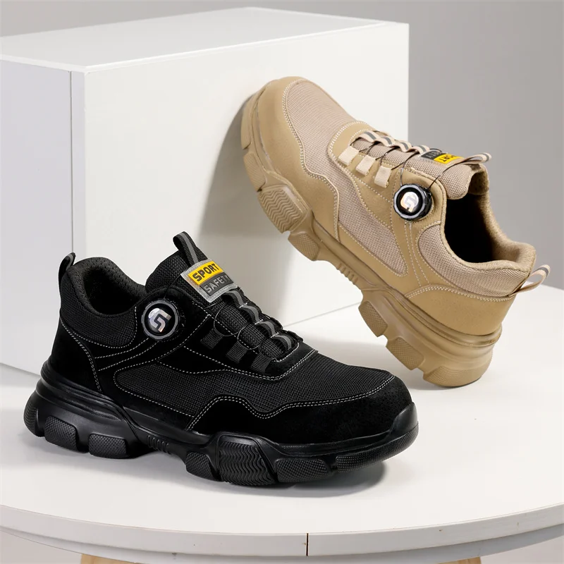 Nuevos zapatos de trabajo con botón giratorio 2025, zapatillas de seguridad, botas transpirables de verano para hombre, calzado ligero indestructible con punta de acero