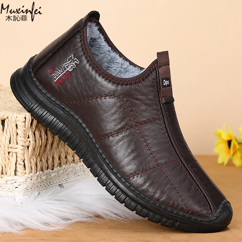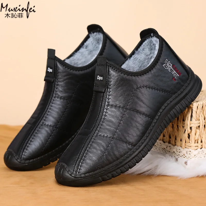 Zapatos de algodón de invierno para hombre, botas de nieve gruesas de felpa cálidas, superficie de cuero informal, botas impermeables antideslizantes de talla grande 39-48