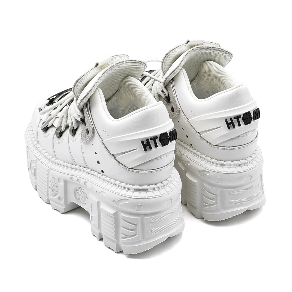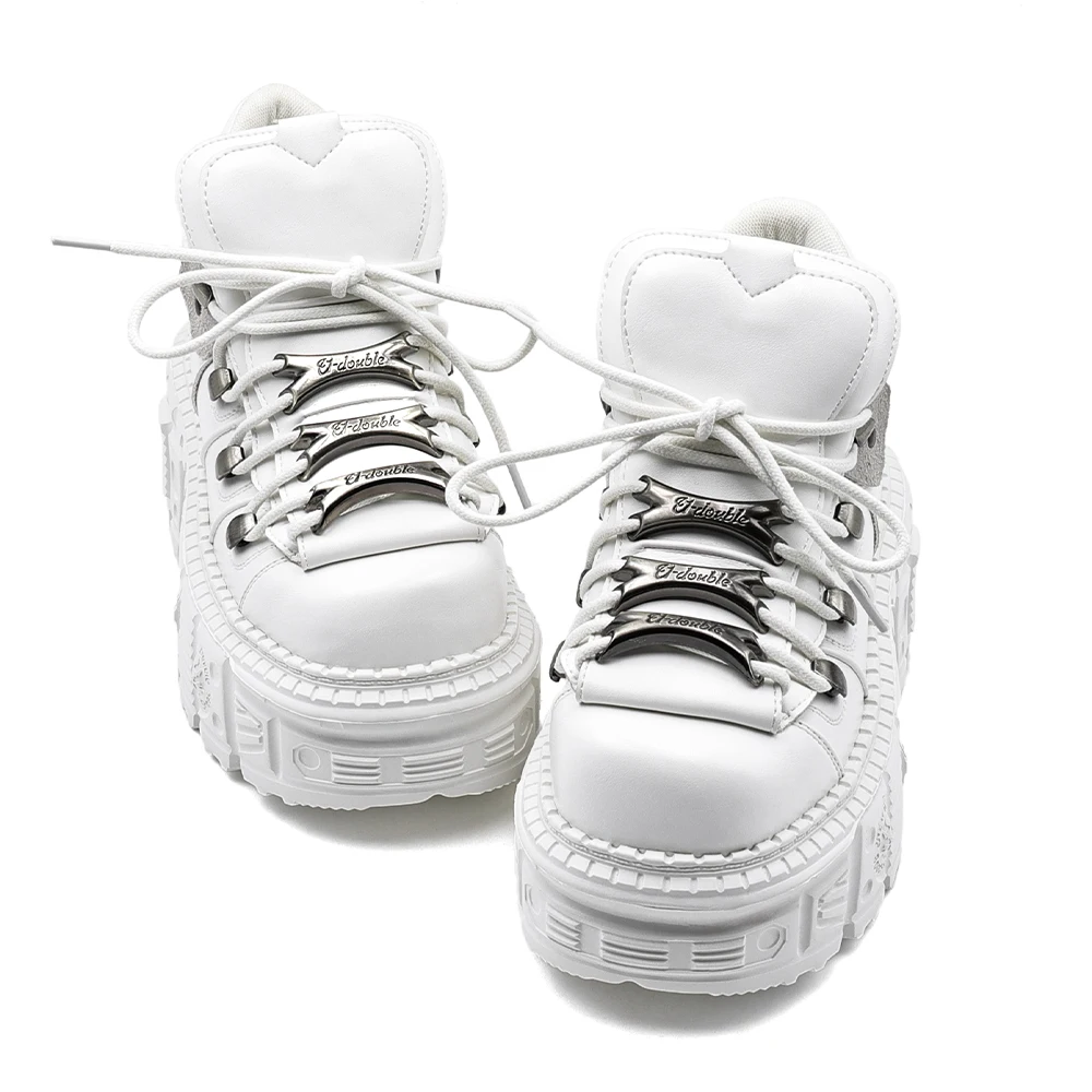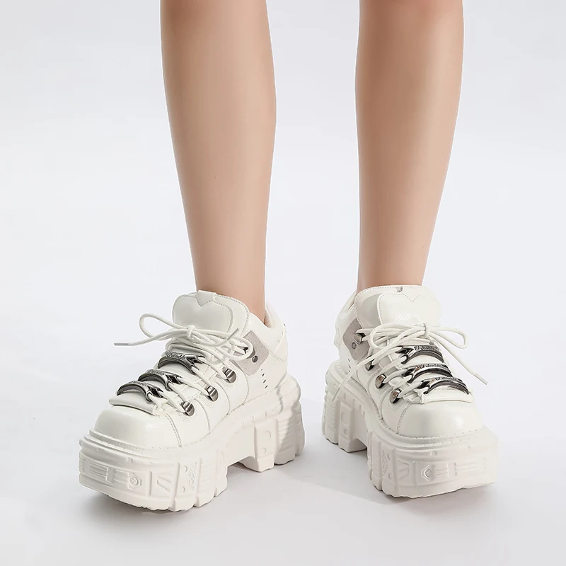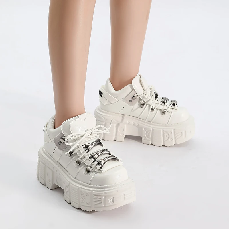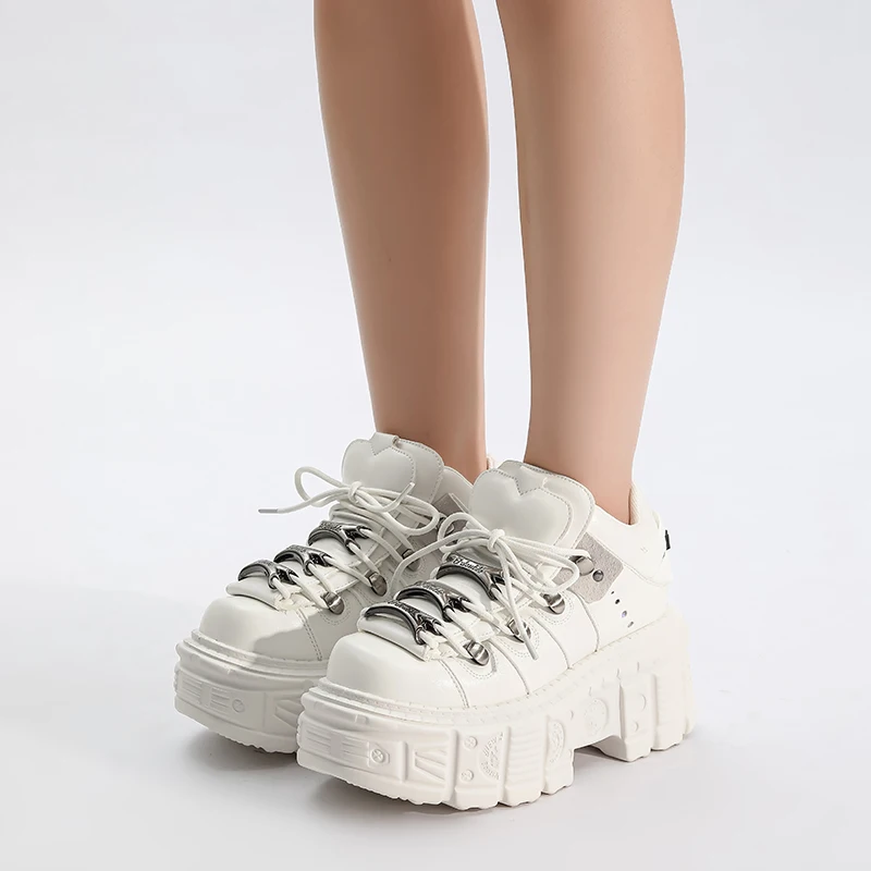 Botas tobilleras góticas Rock, zapatos de mujer con plataforma de cuero blanco, nuevo estilo Punk, zapatos de altura con tacón con cordones, decoración de Metal, zapatillas de deporte para mujer