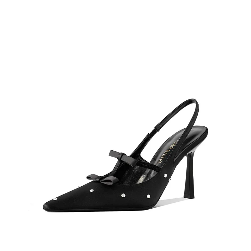 Sandalias de Tacón de Aguja con Punta Puntiaguda y Adorno de Lazo en el Talón, Color Negro/Marrón Café, para Mujer, Ideales para Fiestas y Oficina