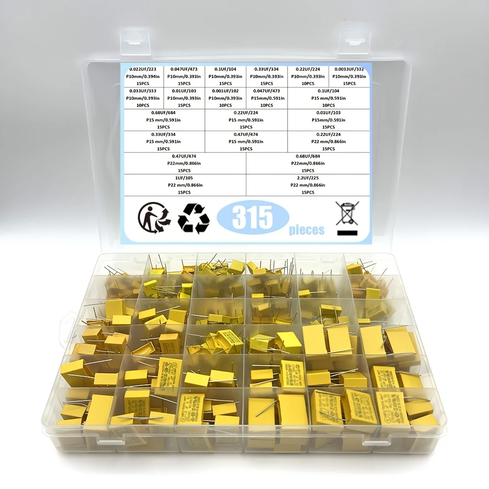 Condensador de seguridad X2, 315 piezas, 21 valores, 275VAC, 102K-225K, 1NF ~ 2,2 UF, 223, 104, 105, 225, 474, 684, 102, 103, 473, 334, caja de Kit surtido