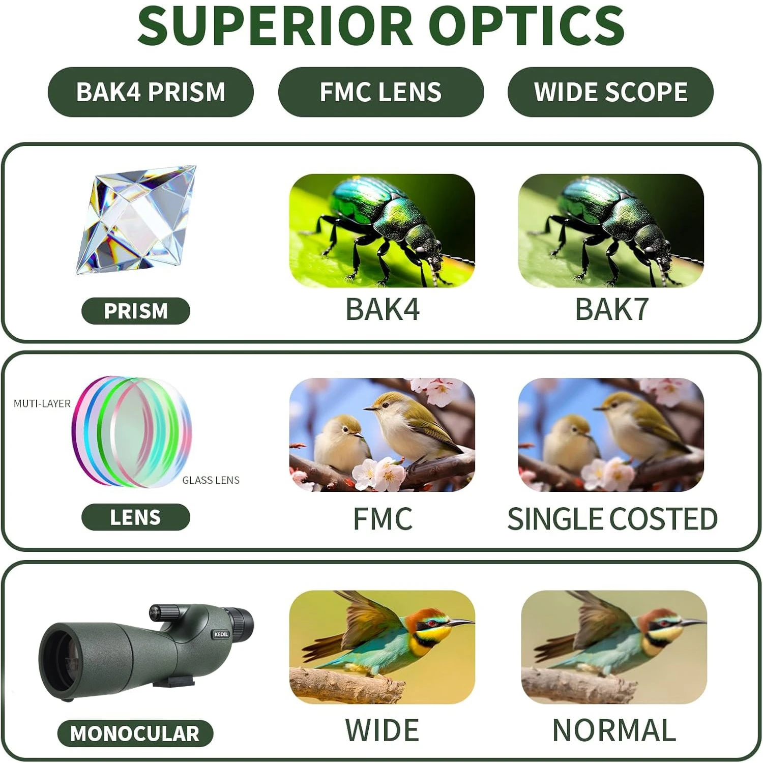Con lentes objetivos totalmente multicapa (FMC) y prisma BAK4, este telescopio ofrece imágenes brillantes y de alto contraste para visualización diurna y condiciones de poca luz, como temprano en la mañana o tarde en la tarde.
