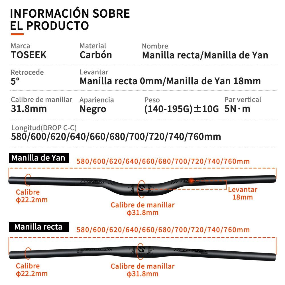 Manillar de bicicleta TOSEEK Mtb de carbono 31,8*580-720/740/760mm manillar negro mate para accesorios de bicicleta de montaña