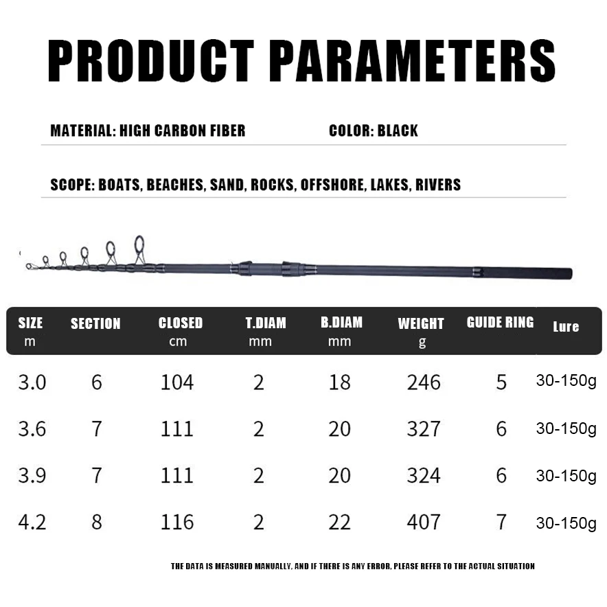 Caña de Pescar Telescópica de Carbono para Carpa y Surfcasting en Agua Salada, 3.0M 3.6M 3.9M 4.2M, con Mango de EVA