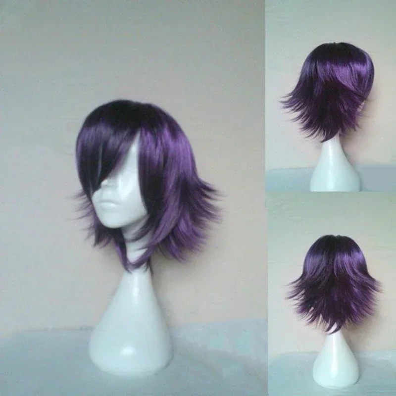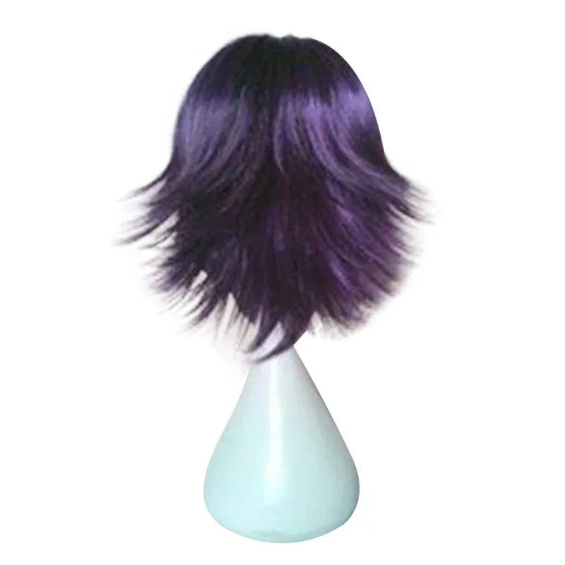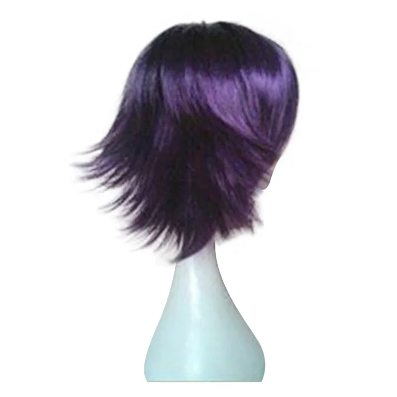 Peluca de Cosplay de Anime, pelucas de pelo sintético, pelucas de fibra de alta temperatura cortas y rizadas, color morado y negro