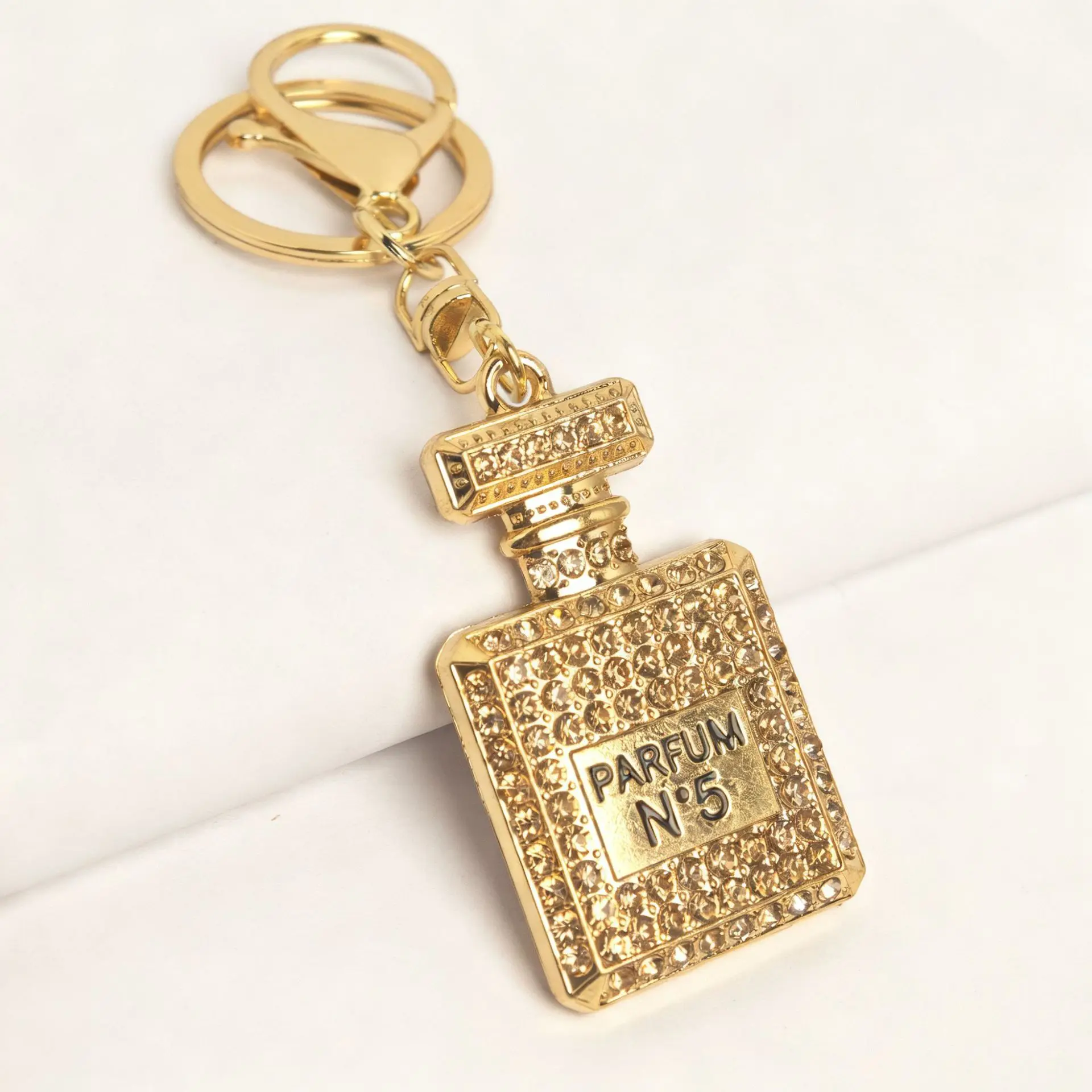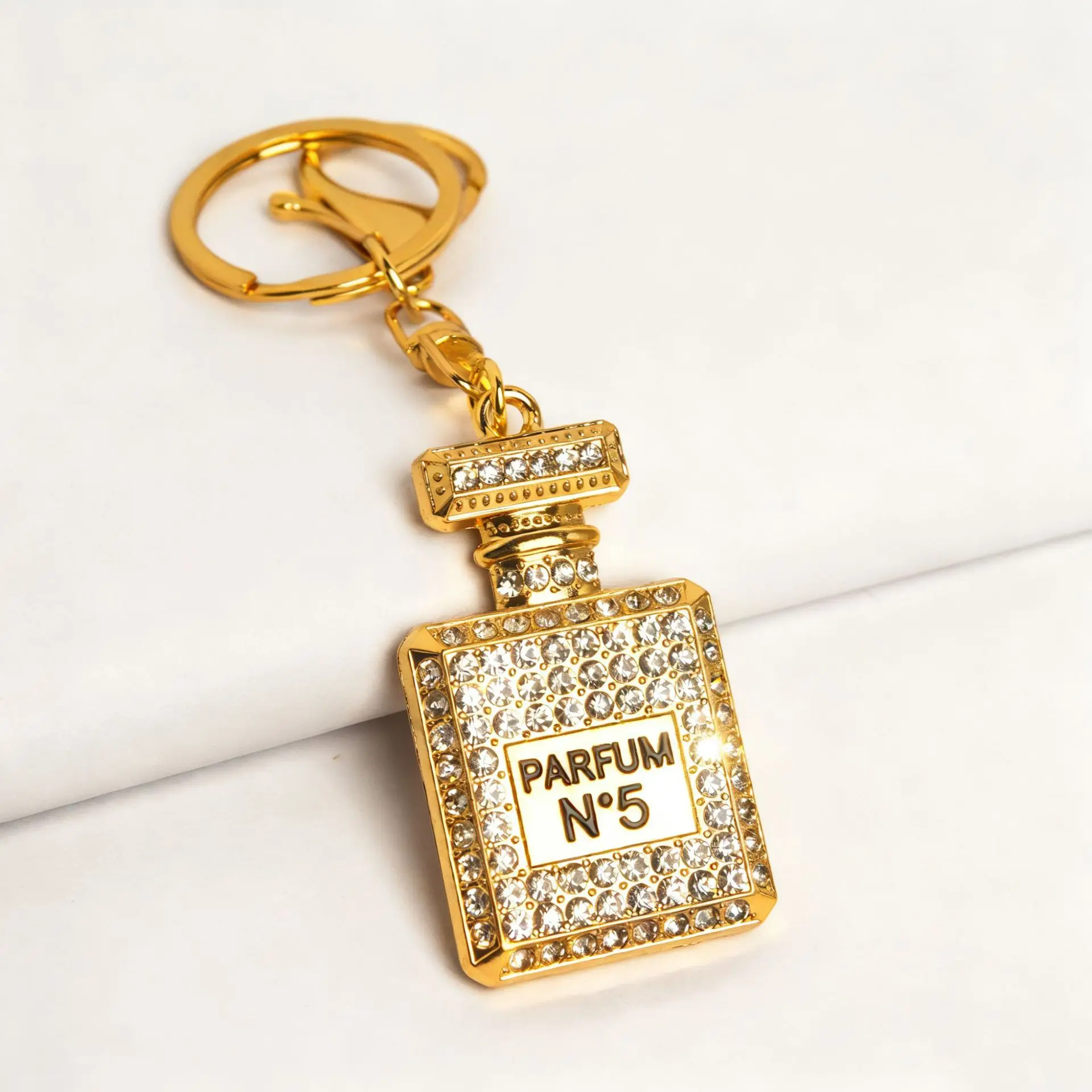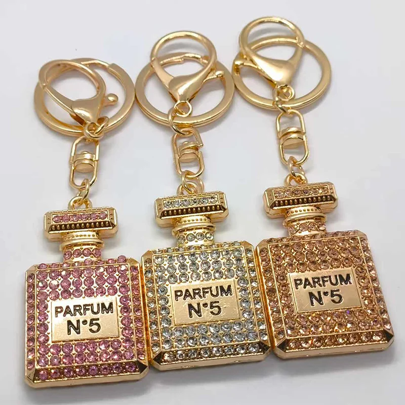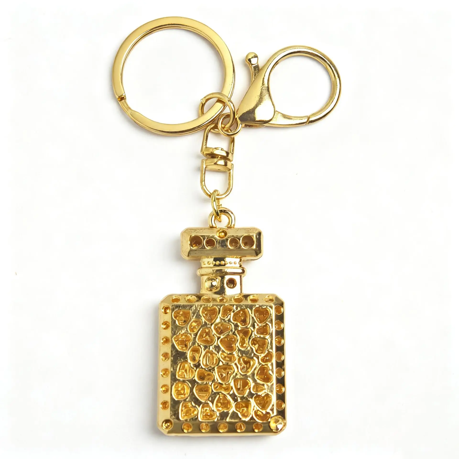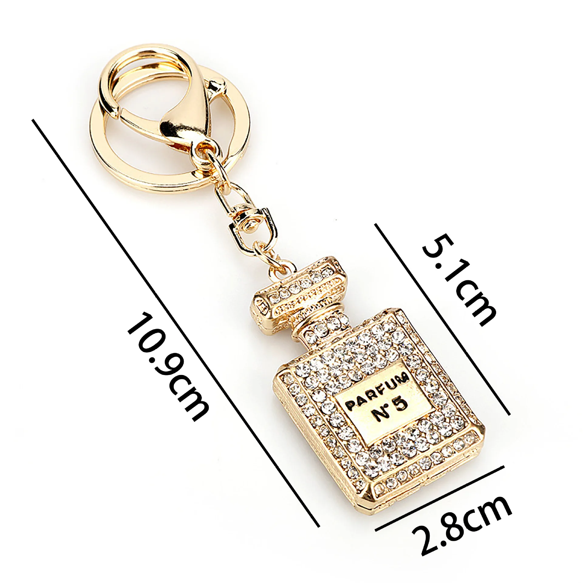 ‌ Llavero con dije de botella de perfume de estilo coreano, metal dorado con diamantes rosas, dorados y blancos, para llaves y bolsos, accesorio de regalo ideal