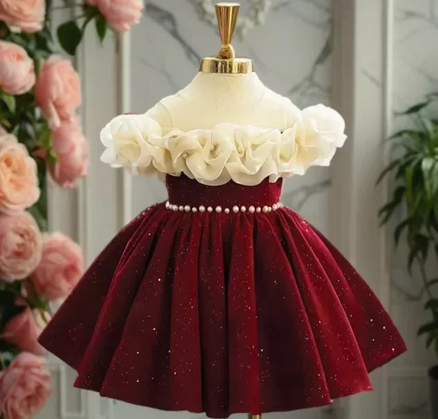 2025 vestido para niños para fiesta de Eid vestidos de princesa de alta gama flor roja niño boda niña cumpleaños disfraz de Piano