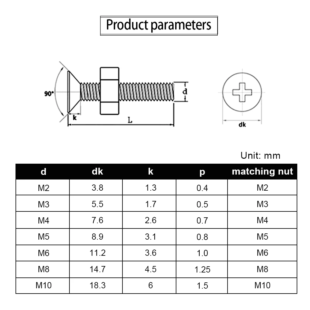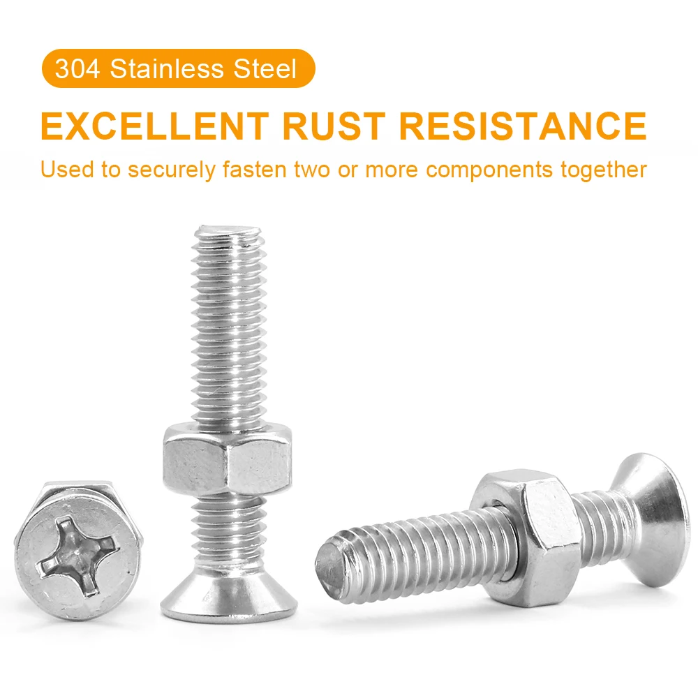 2-50 juegos de tornillos Phillips de cabeza plana con tuercas M1 M2 M3 M4 M5 M6 M8 M10, kits de tornillos y tuercas de acero inoxidable con cabeza avellanada cruzada