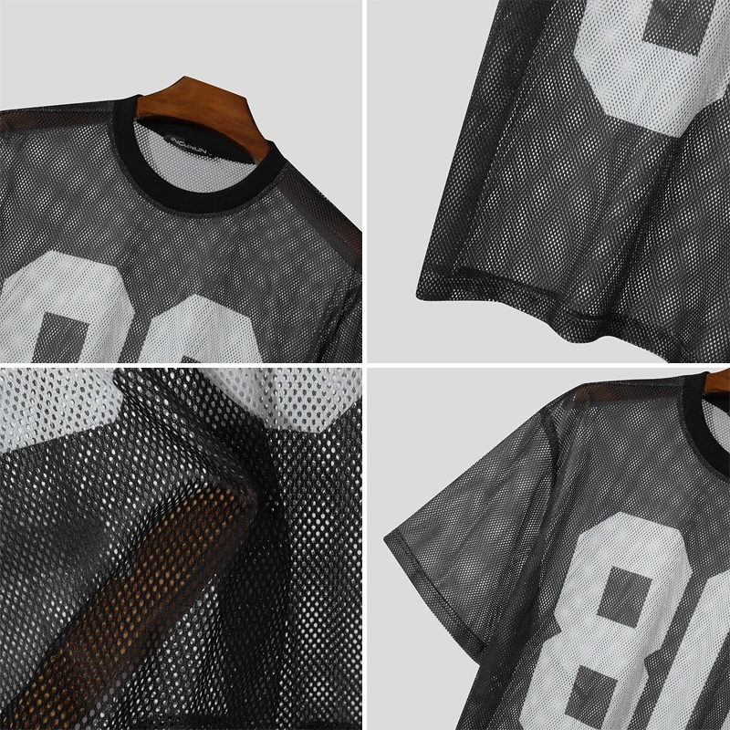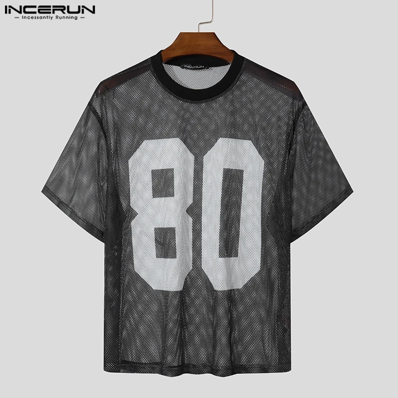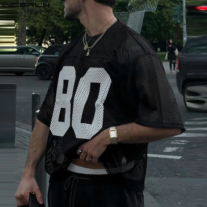 INCERUN-camisetas holgadas con empalme de malla para hombre, Camiseta de manga corta con diseño hueco, Tops informales con estampado Digital de gran tamaño 2024