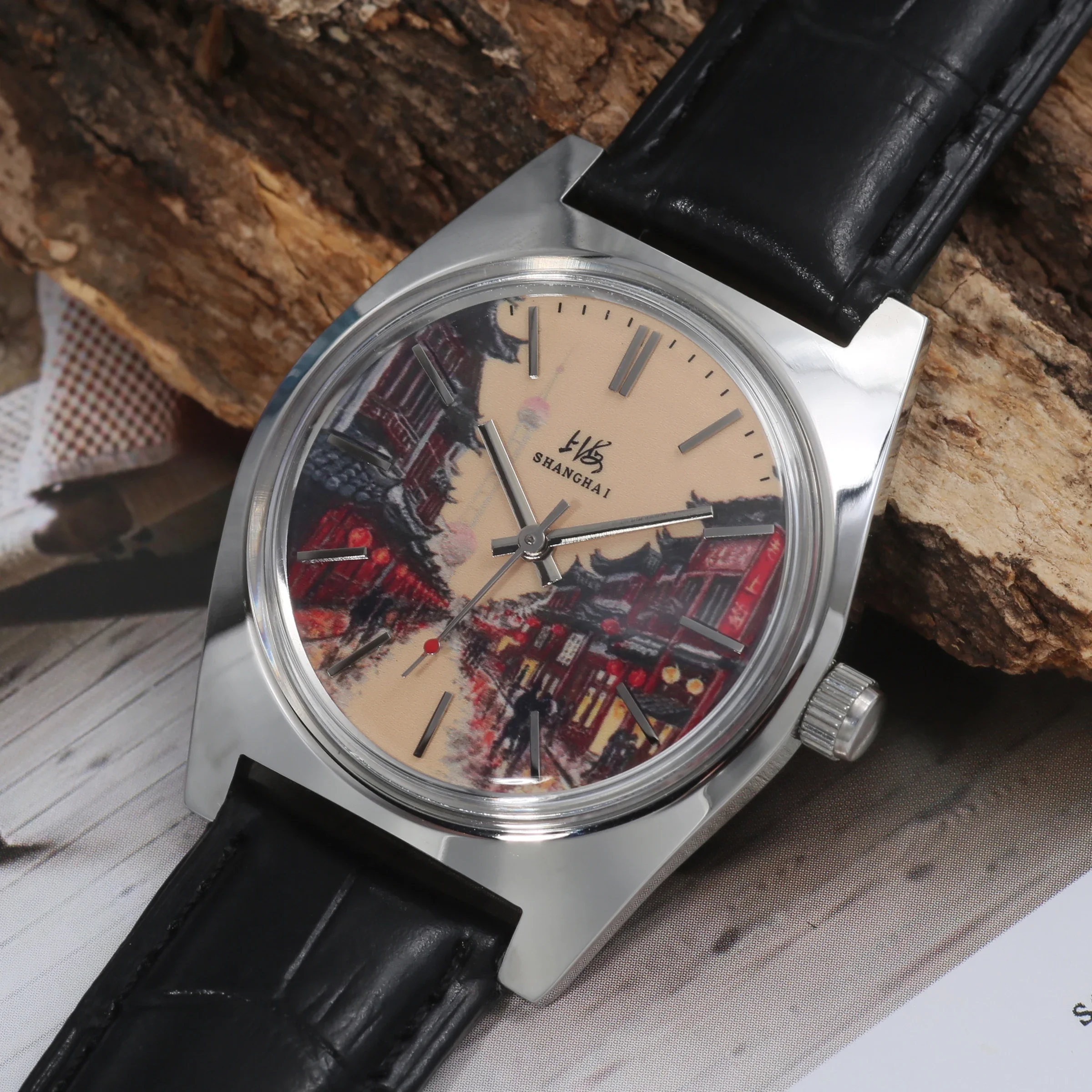 Reloj mecánico Shanghai de cuerda manual de 36MM 7120 reloj de diseño Bauhaus resistente al agua para hombres esfera esmaltada