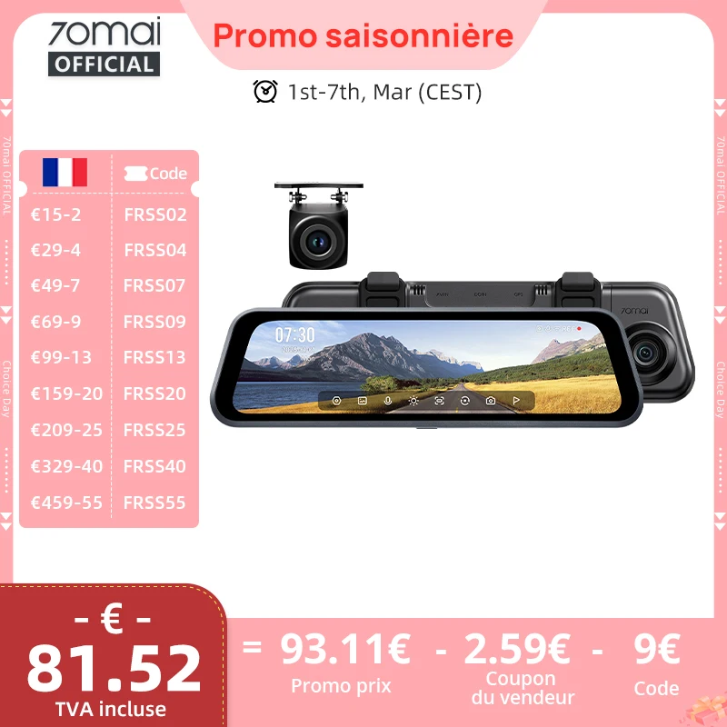 Caméra de tableau de bord 70mai S410 avec écran miroir 9,35 pouces, caméra avant 2K, caméra arrière 1080P, ouverture F1.55, supercondensateur, protection 24h/24 et 7j/7, 70mai S410