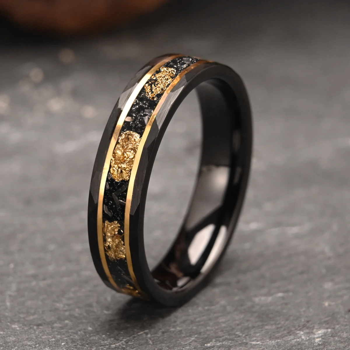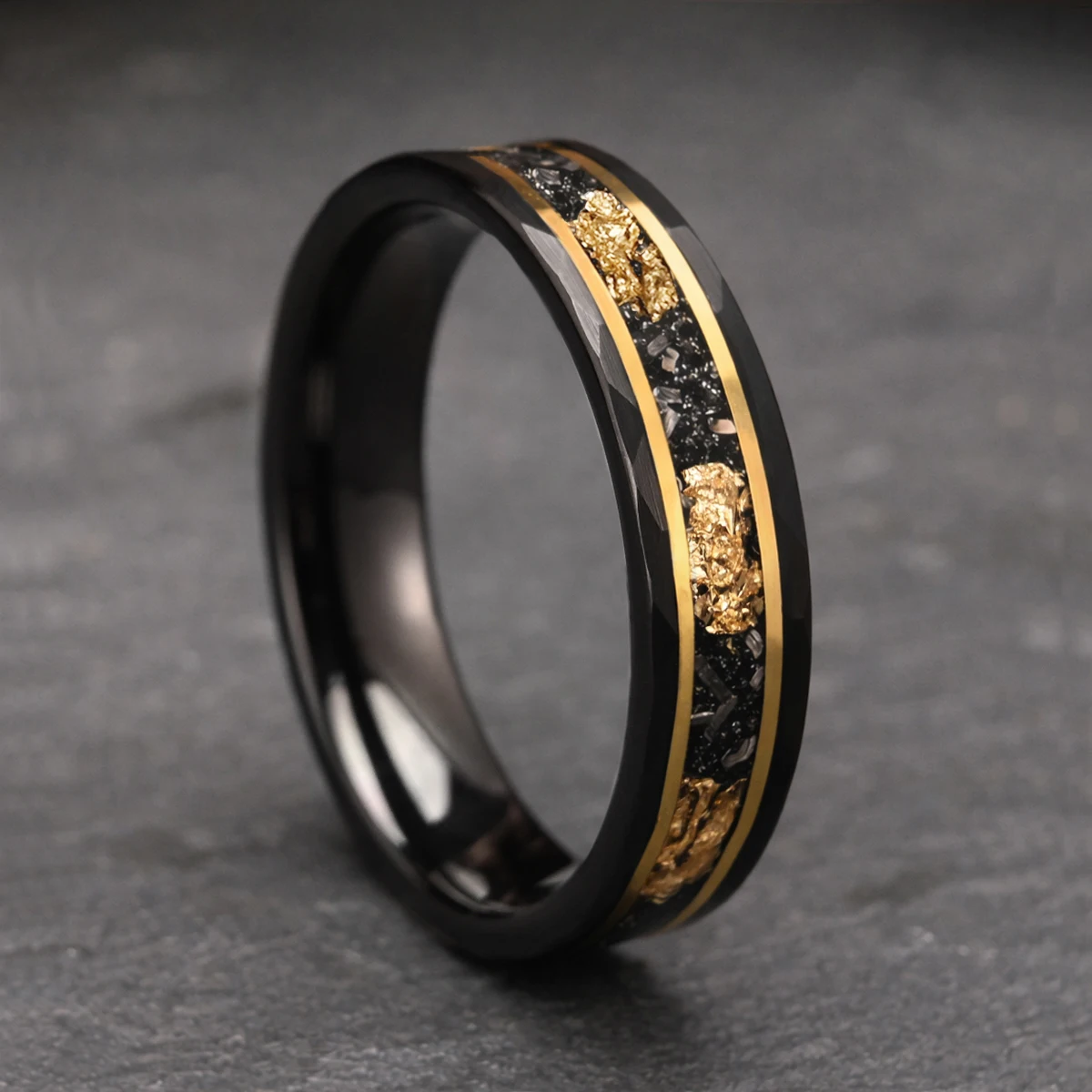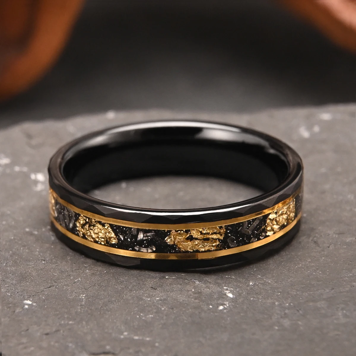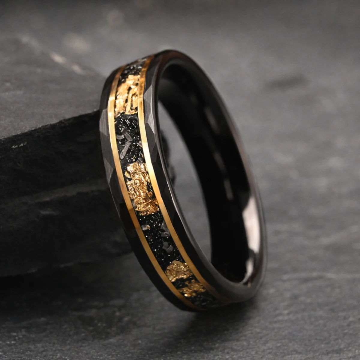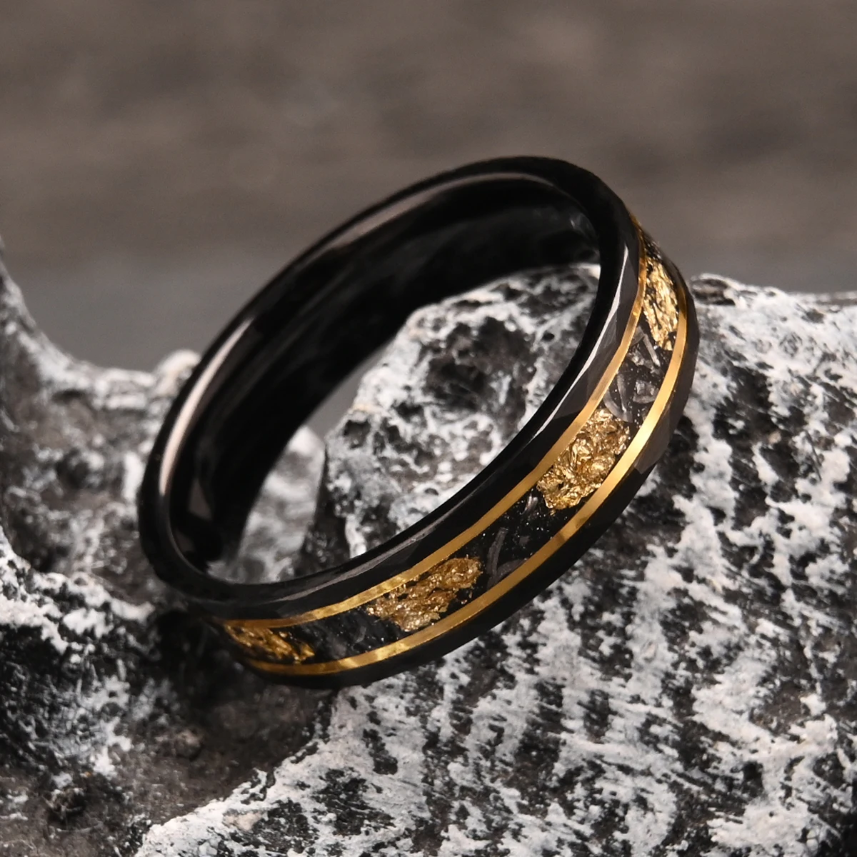 Bague en carbure de tungstène noir 8 mm/6 mm incrustée de feuille d'or et de météorite, alliances pour hommes, bijoux de mode, bagues de fiançailles et de promesse