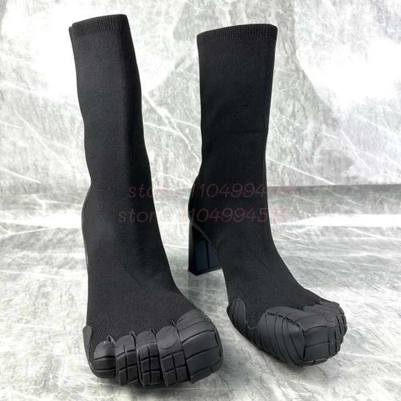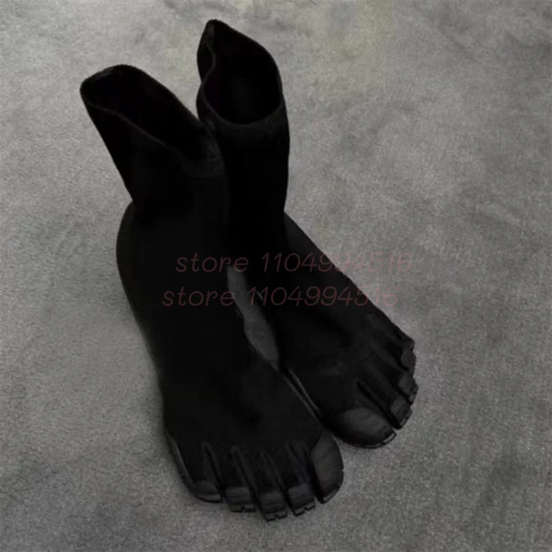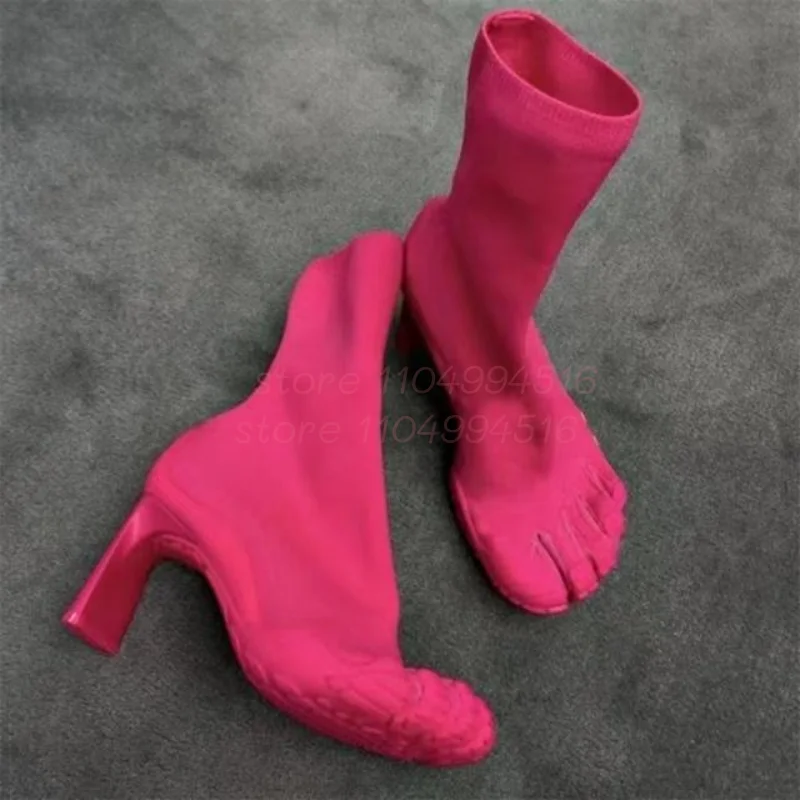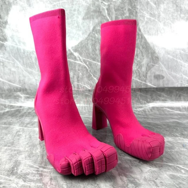 Femmes Fuchsia daim cinq doigts bottes en cuir noir bout fendu talon carré mi-mollet bottes sexy mode fête défilé chaussures