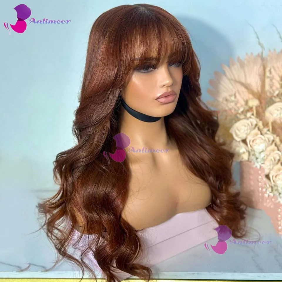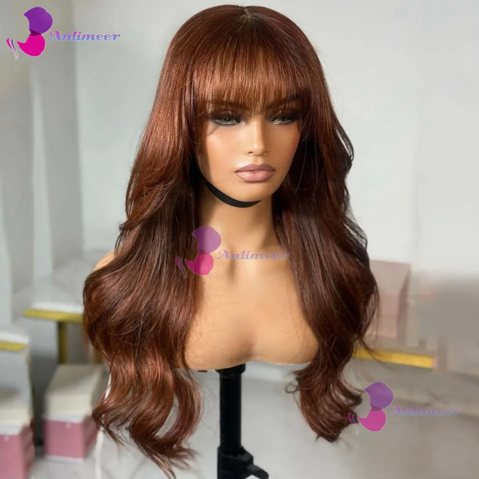 Perruques Auburn à franges, brésiliennes, ondulées, sans colle, châtain brun, avec base en soie 5x5, perruques à fermeture avec franges, perruques frontales en dentelle 13x6/360