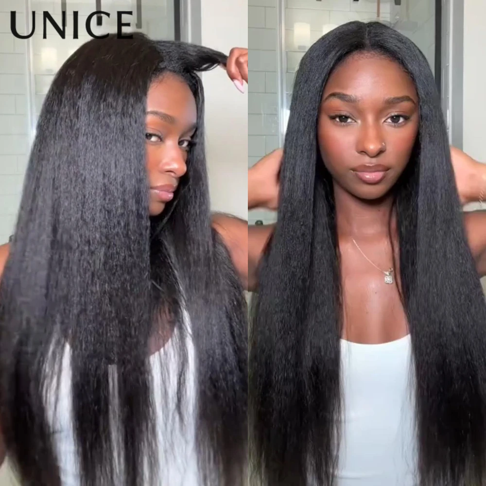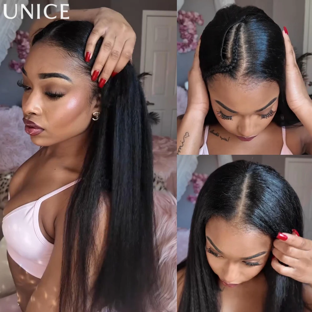 UNice InvisiBlend ™ Perruque Kinky Straight V Part avec cordon de serrage, noir naturel, 100% cheveux humains, sans colle, convient à toutes les tailles de tête
