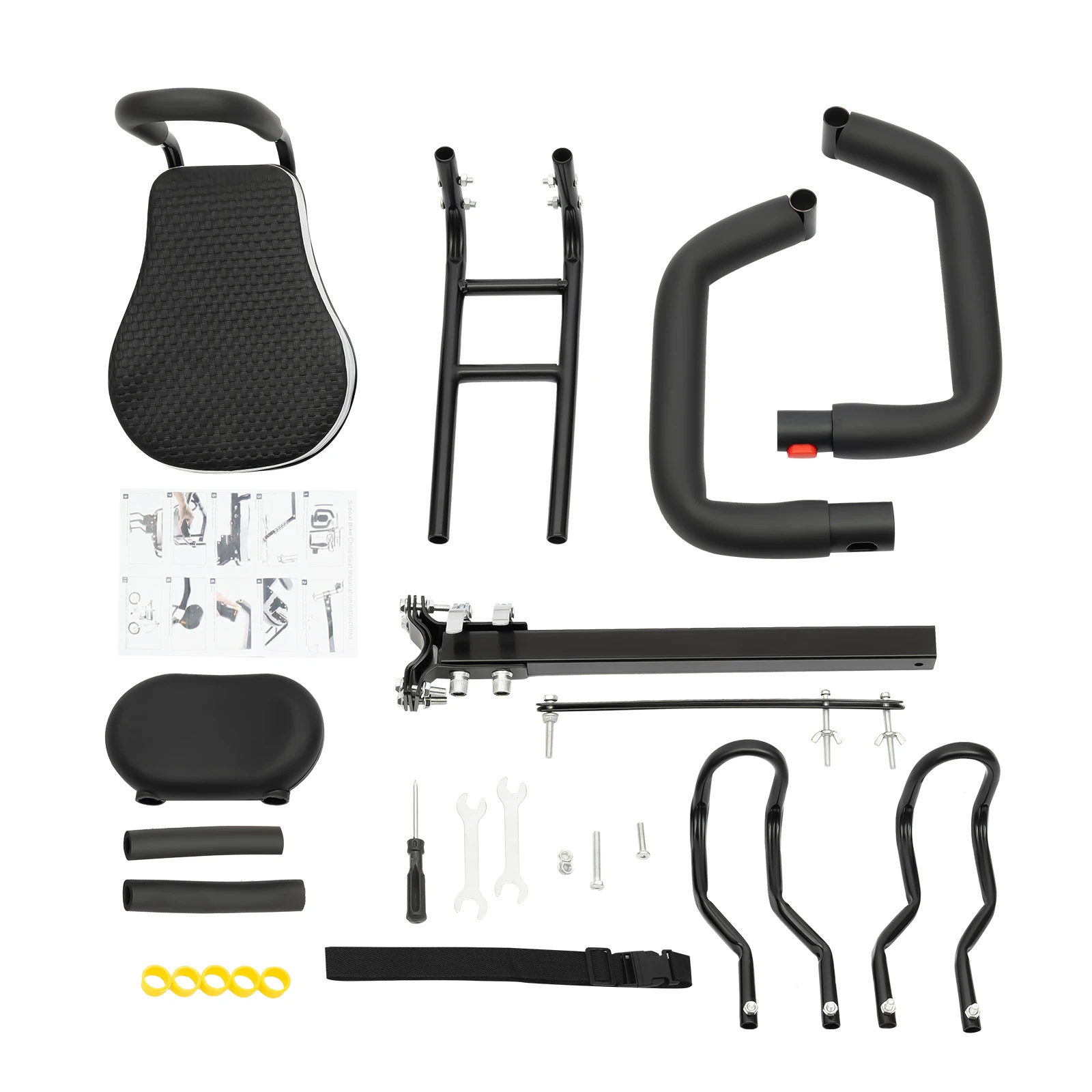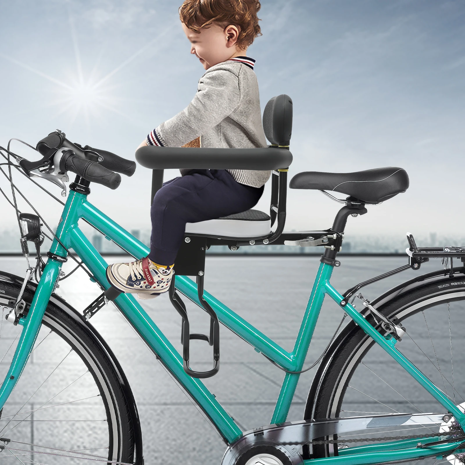 Siège de vélo pour enfant à fixation avant, siège enfant à deux points de fixation, siège avant amovible avec main courante pour tout-petit, construction en acier et polycarbonate