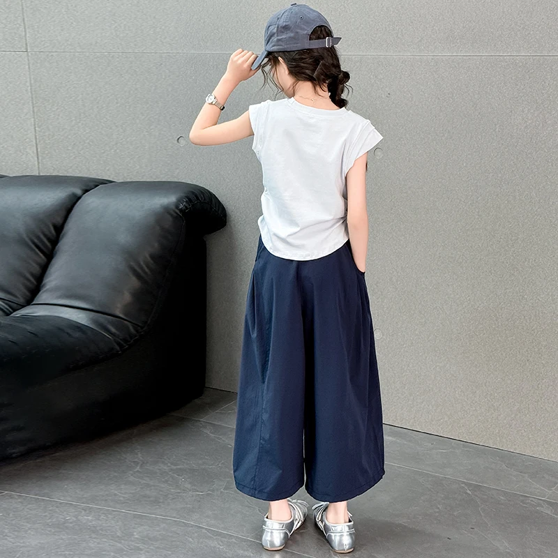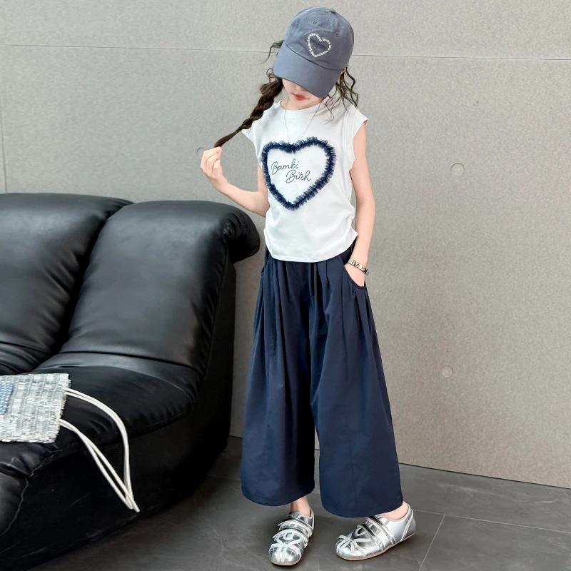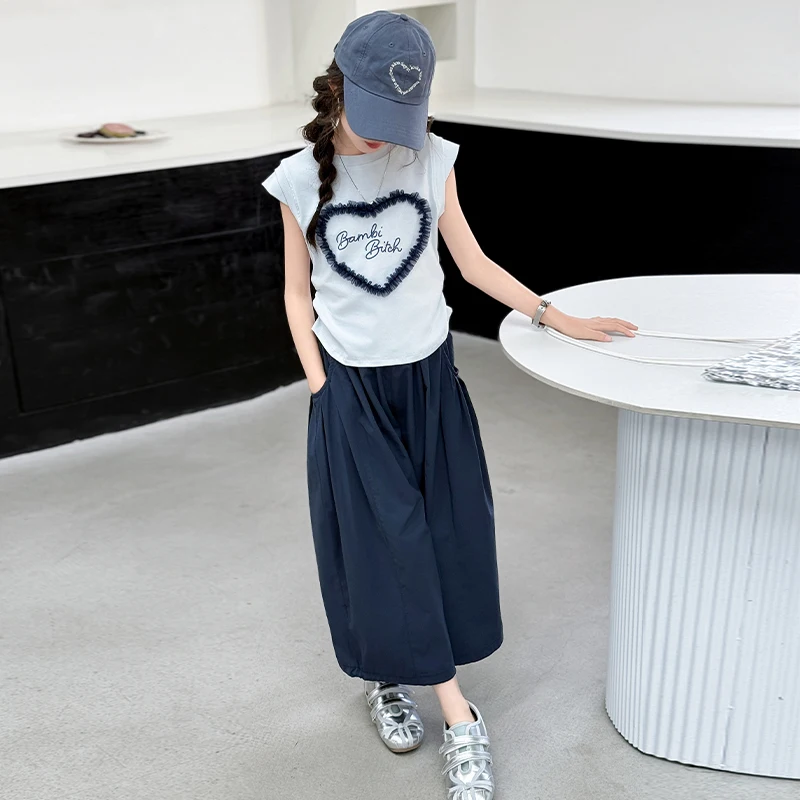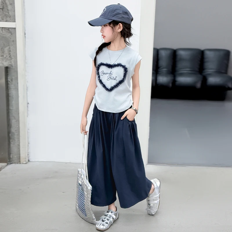 Nouveau élégant enfants fille été coeur T-shirt et pantalon court ensemble de vêtements enfants haute couture Streetwear tenue survêtement 5-14