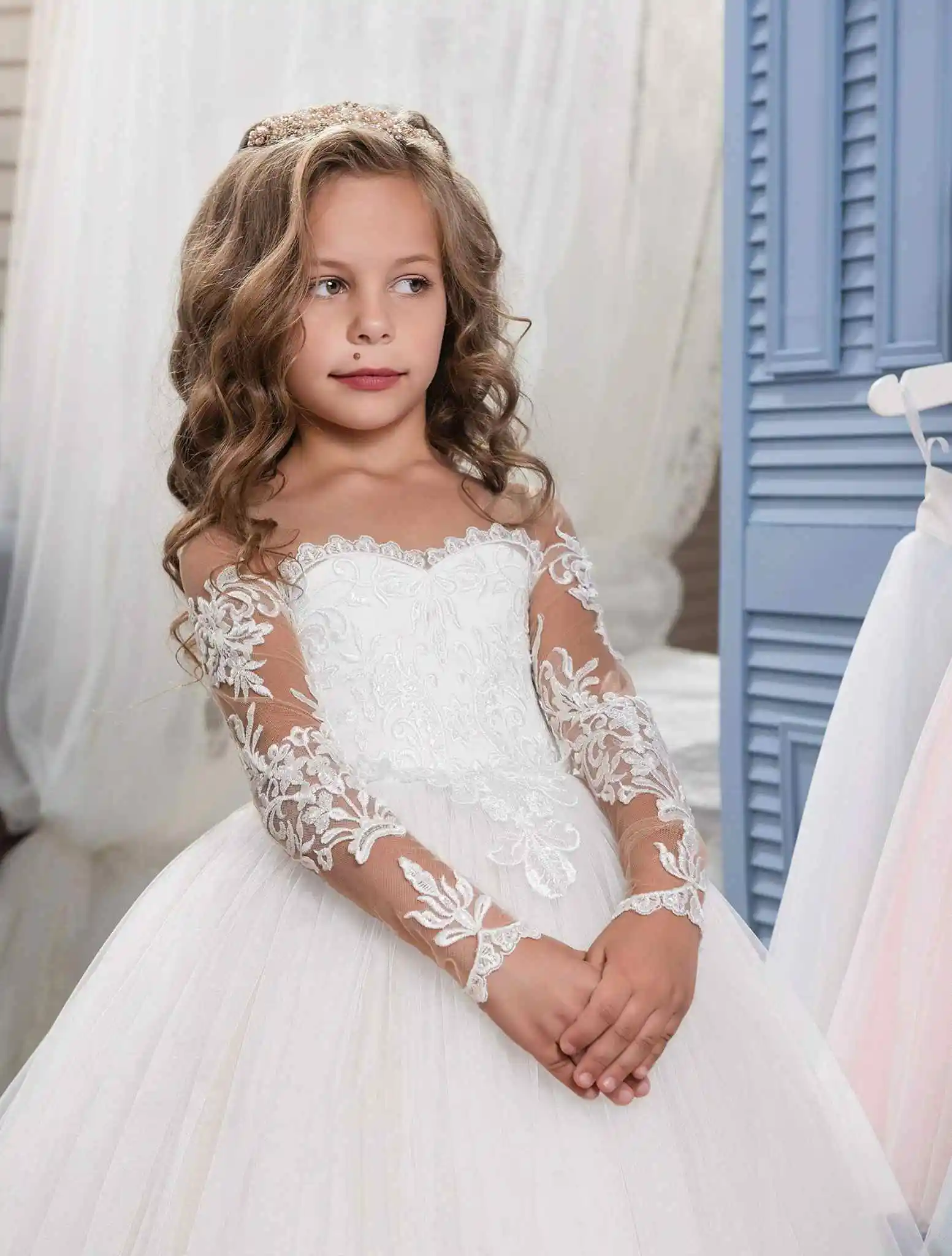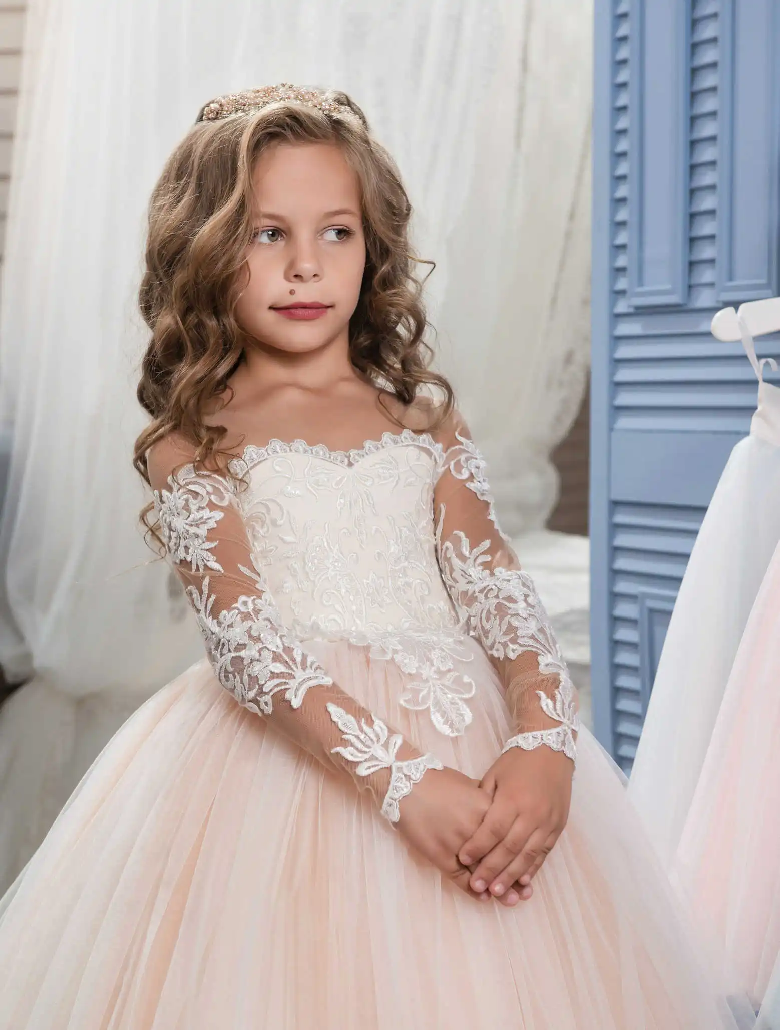Robe de princesse brodée en dentelle, manches longues, pour enfants, fleur, fête de mariage, cérémonie de remise de diplôme, robe de nettoyage au sol