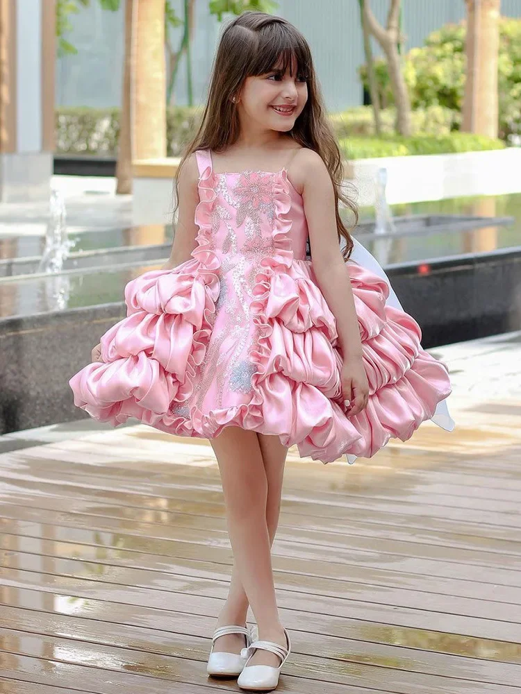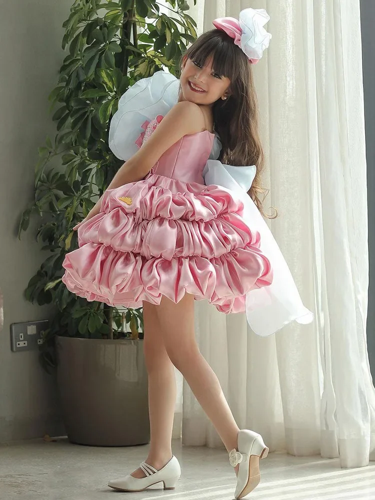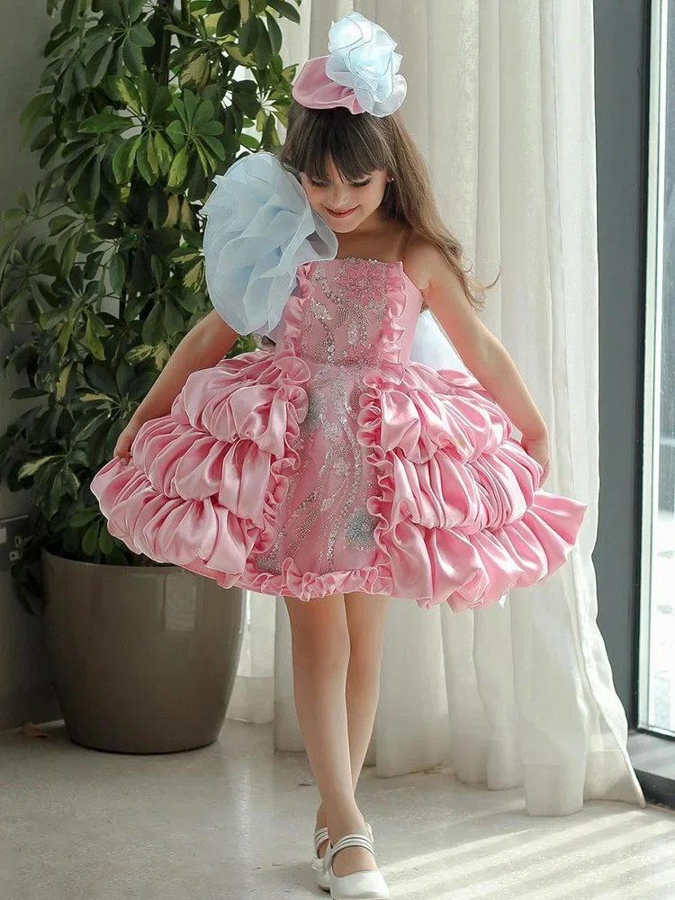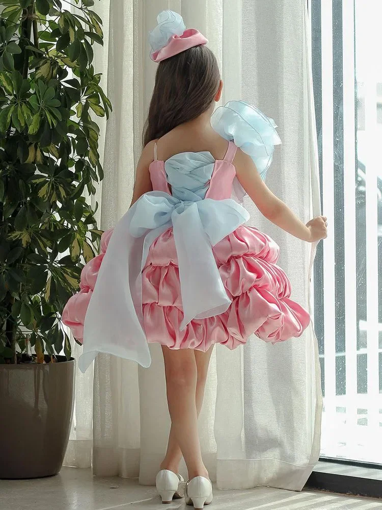 Robe de princesse lolita pour filles, nœud d'été, robe gâteau bouffante rose pour enfants, modèle de défilé de mode et vêtements de performance